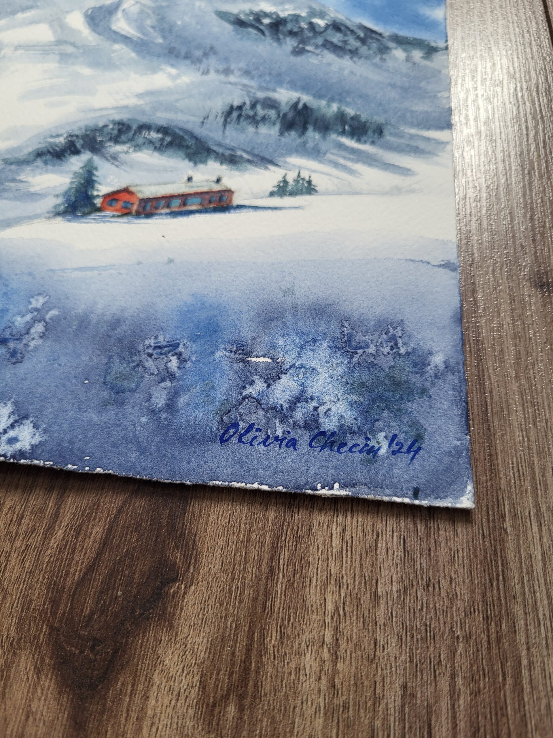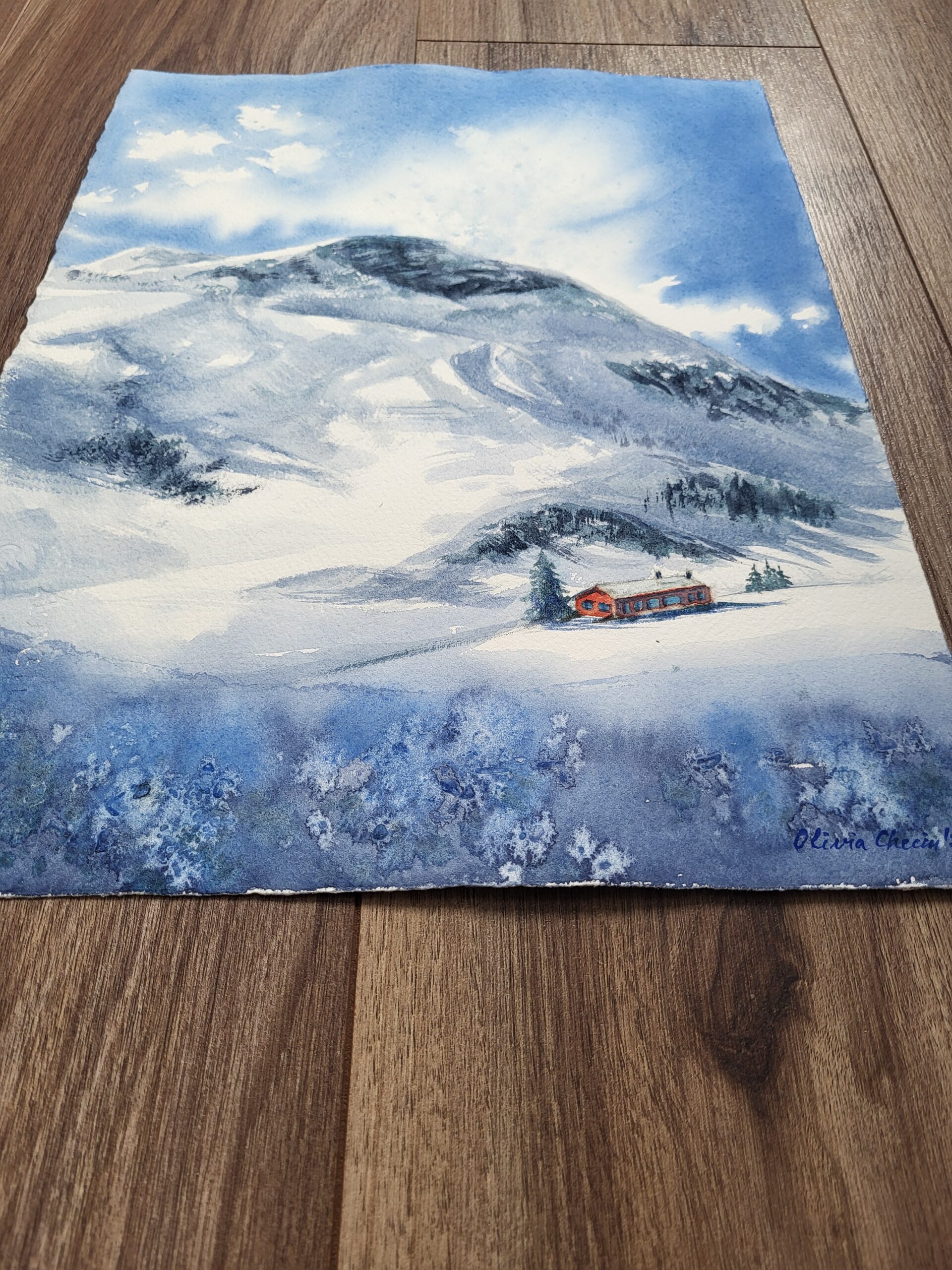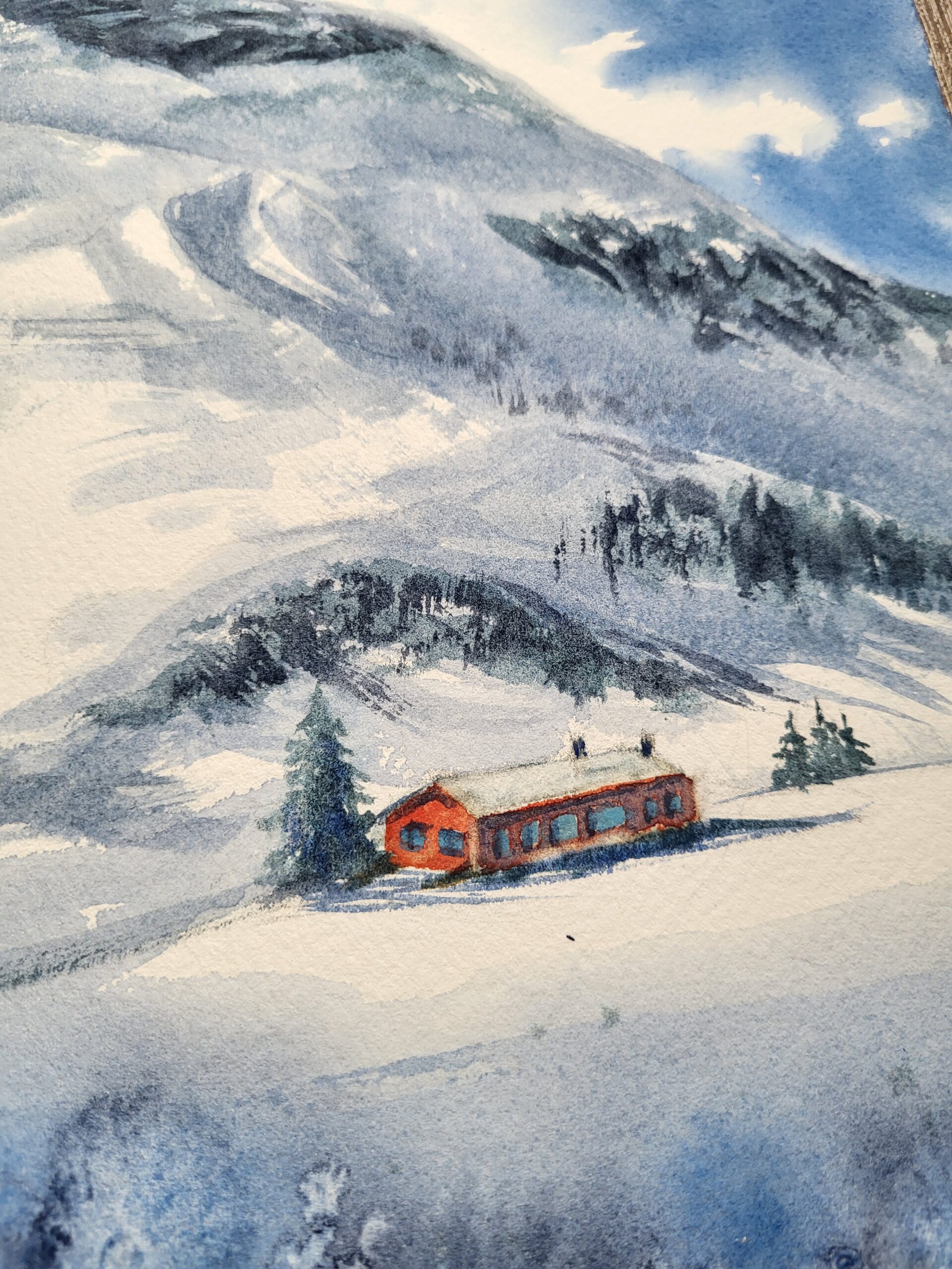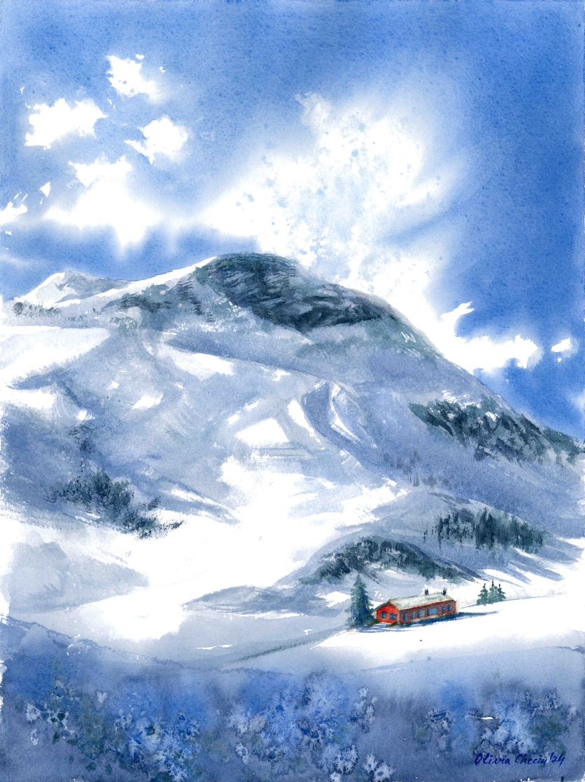 This watercolor painting depicts a majestic winter mountain landscape, where a snow-covered French Alps peak rises dramatically against a vivid blue sky. The composition emphasizes the contrast between the cool tones of the mountain and the warmth of a small cabin nestled in the valley below. The foreground is a wide expanse of snow, painted with soft washes of blue and violet to suggest subtle shadows across the slope. The untouched white of the paper forms the brightest highlights, giving the snow a crisp, luminous quality. At the lower right, a cluster of trees and a red cabin stand out vividly against the whiteness, their warm tones providing a striking focal point. The midground shows rolling snowy hills leading up toward the mountain. Gentle washes of gray and blue create depth and texture, while darker strokes suggest patches of exposed rock and clusters of evergreen trees. The background is dominated by the towering mountain, painted in layered washes of deep blue, gray, and green. Its rugged slopes are softened by snow, with untouched areas of paper suggesting glistening highlights where sunlight strikes the surface. The sky is a brilliant wash of blue, with clouds and bursts of light created by leaving areas of the paper white. The effect suggests sunlight breaking through, illuminating the mountain and enhancing the sense of grandeur. The technique combines broad washes for the sky and mountain, layered tones for depth, and fine detailing for the cabin and trees. The preserved white of the paper enhances the brilliance of the snow and the radiance of the sky.