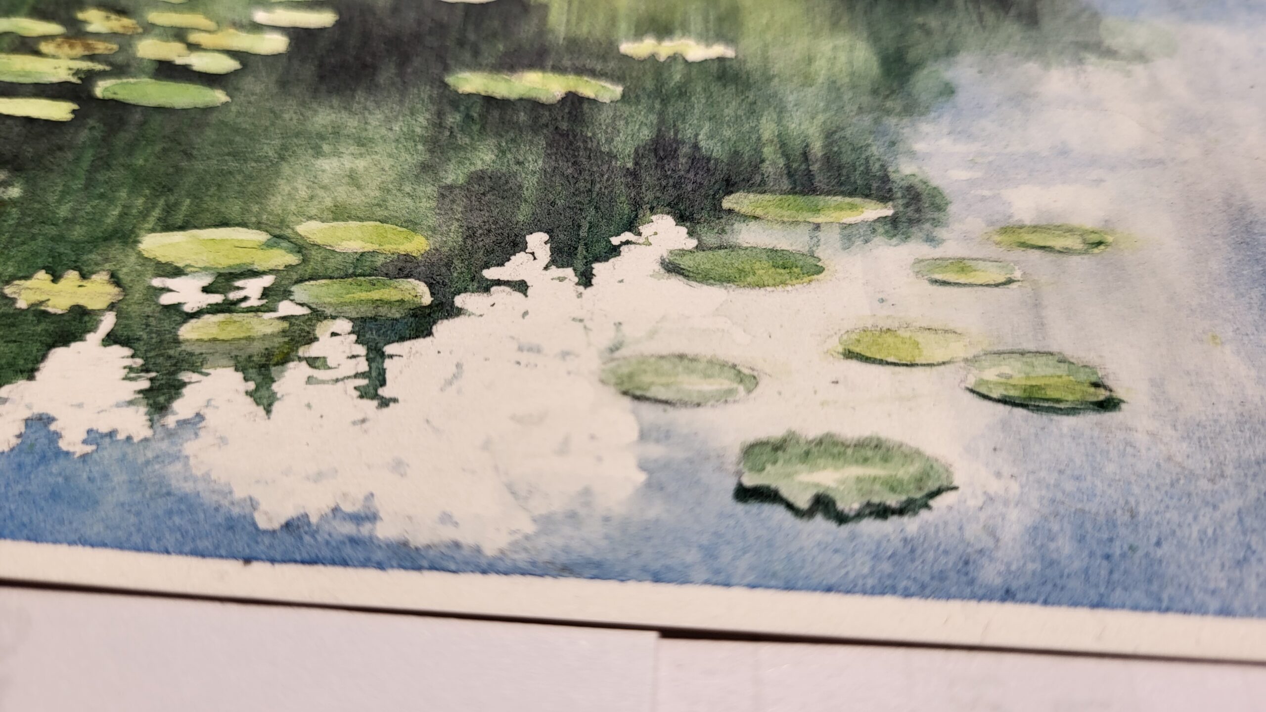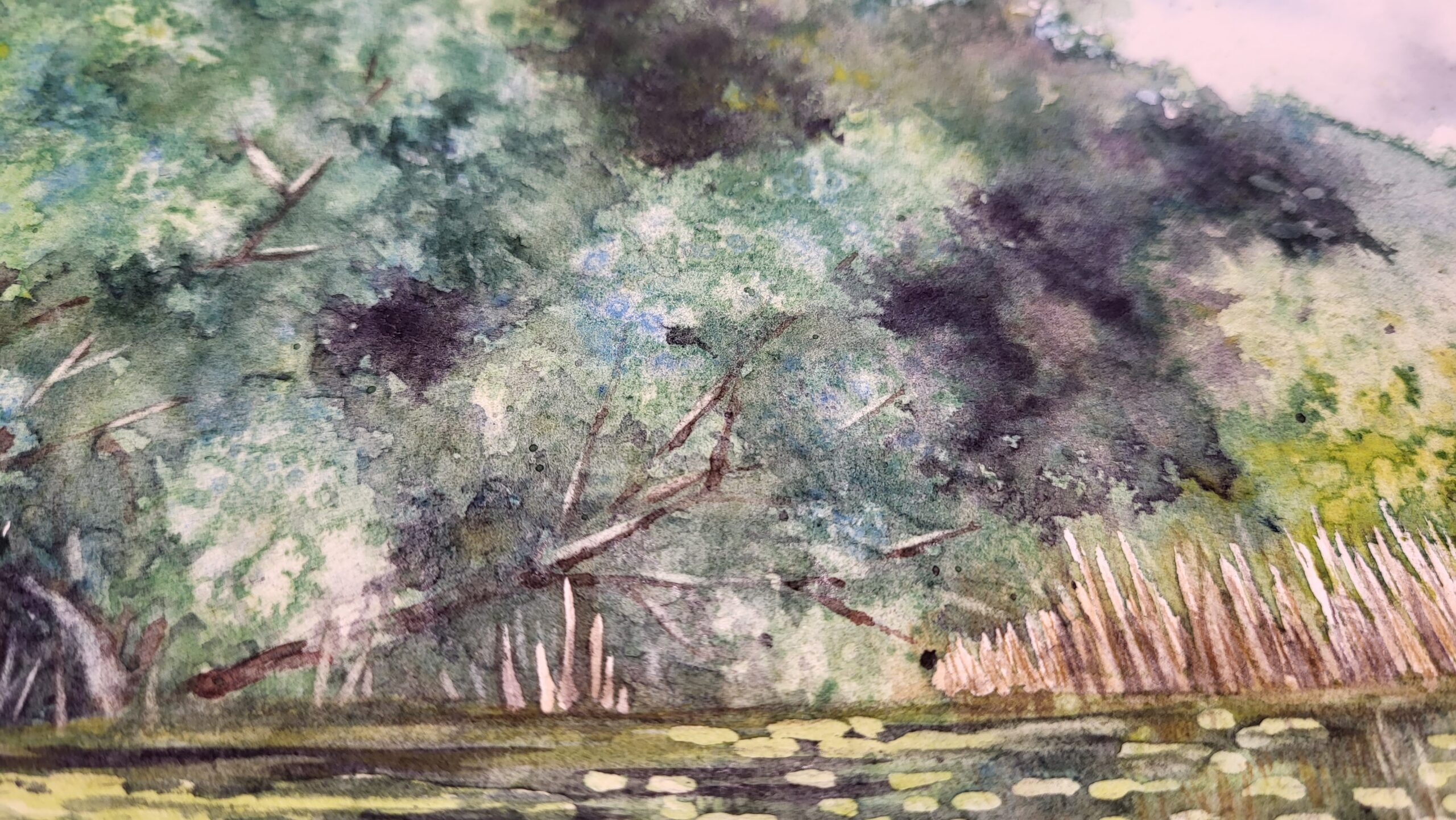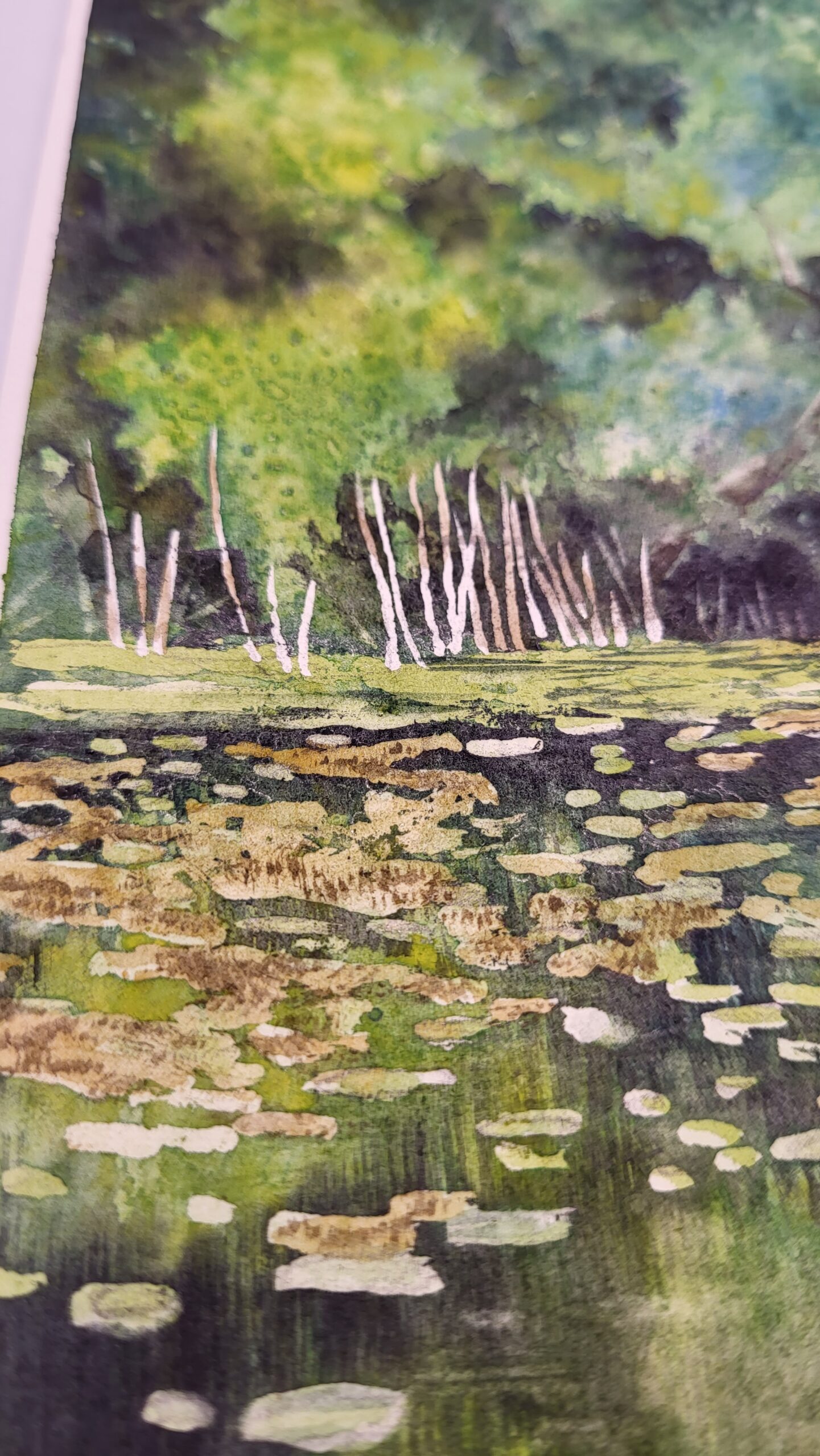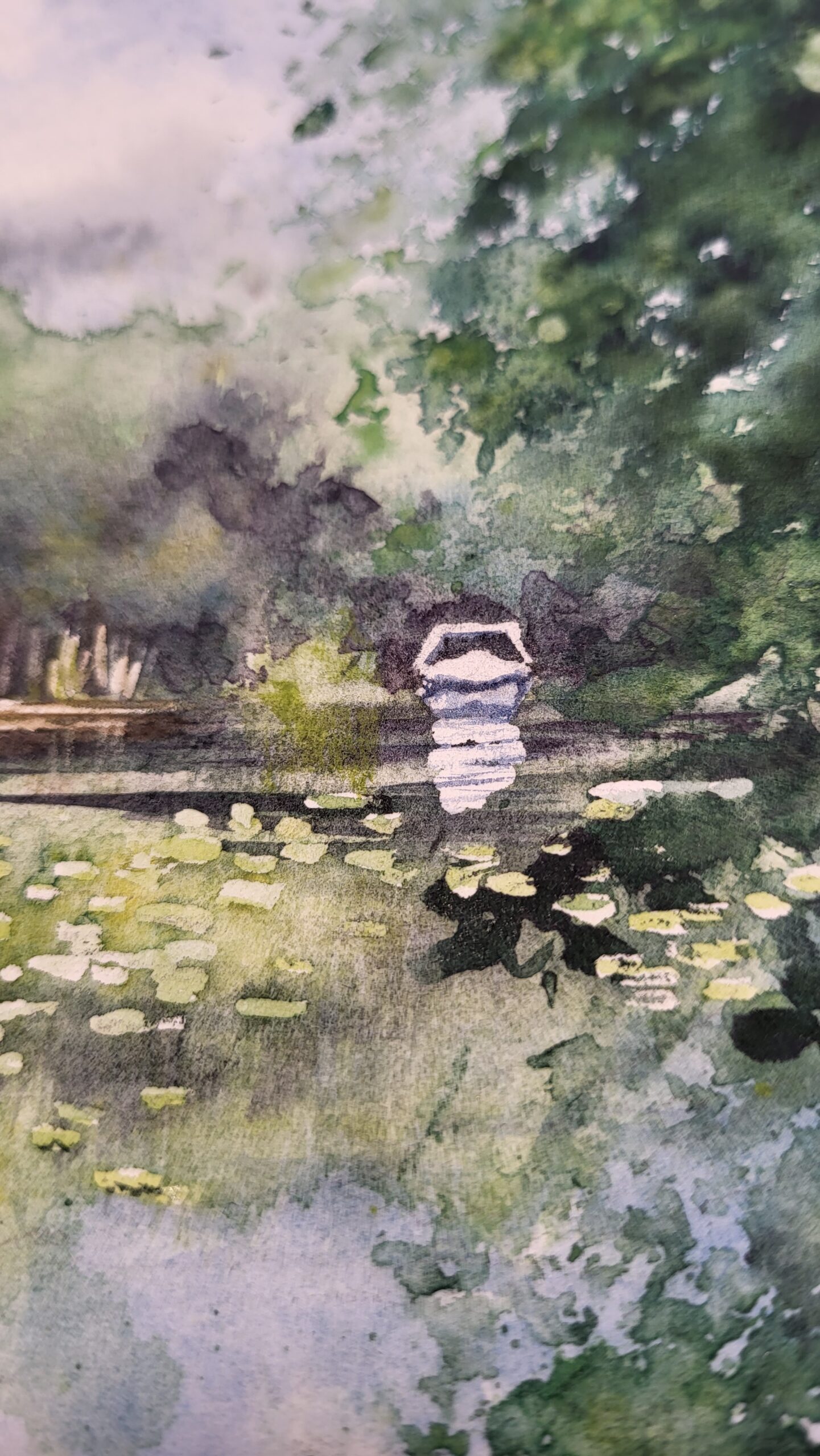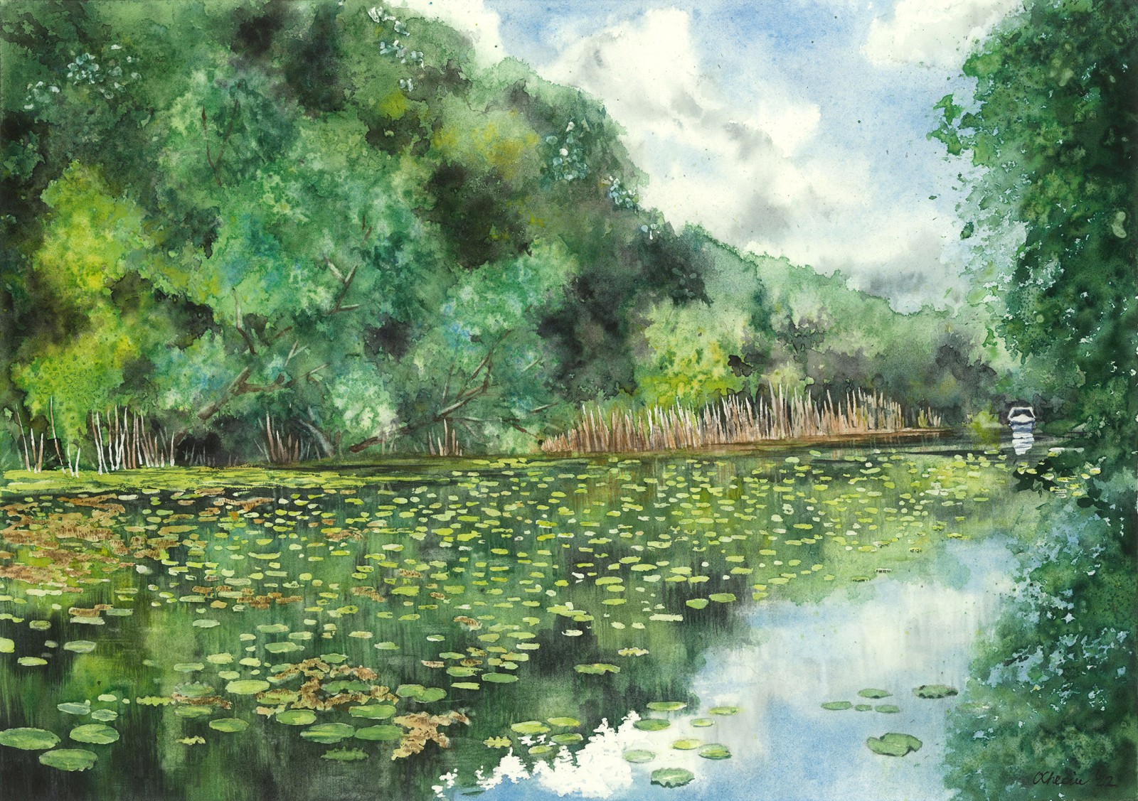 This watercolor painting depicts a calm lake bordered by dense green trees, with lily pads scattered across the water’s surface and a distant white boat, in Snagov, Romania. The composition emphasizes tranquility and reflection, using layered washes and varied brushwork to capture both detail and atmosphere. The water is painted with smooth washes of green and blue, reflecting the trees and sky above. Lily pads are suggested with rounded, preserved shapes, their placement creating rhythm and depth across the surface. Subtle highlights and lifted areas suggest sunlight glinting on the ripples. The trees along the shoreline are rendered with layered washes of green, ranging from deep shadows to bright, sunlit tones. Stippling and dry brush techniques add texture, while the vertical strokes of reeds at the water’s edge provide contrast and structure. The sky is painted with soft, wet-on-wet washes of blue and white, blending seamlessly into cloud formations that enhance the calm mood of the scene. The technique combines fluid washes for atmosphere, stippling for foliage, and precise strokes for details like reeds and lily pads.