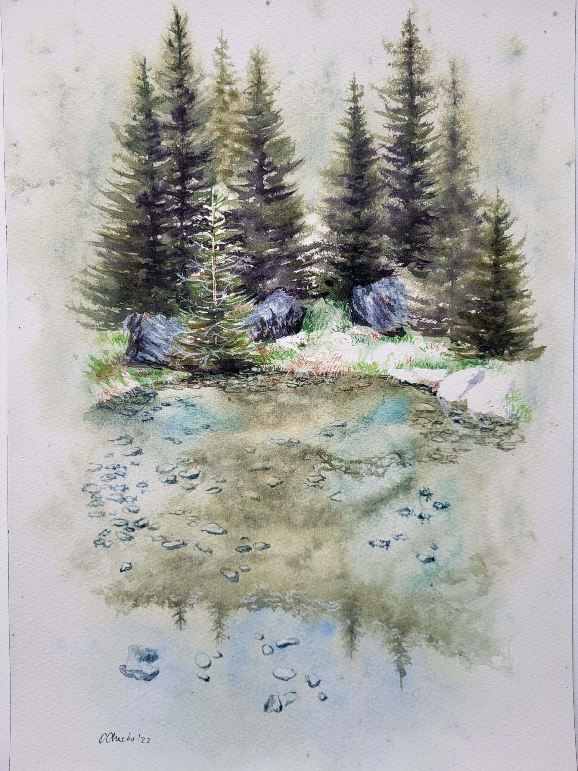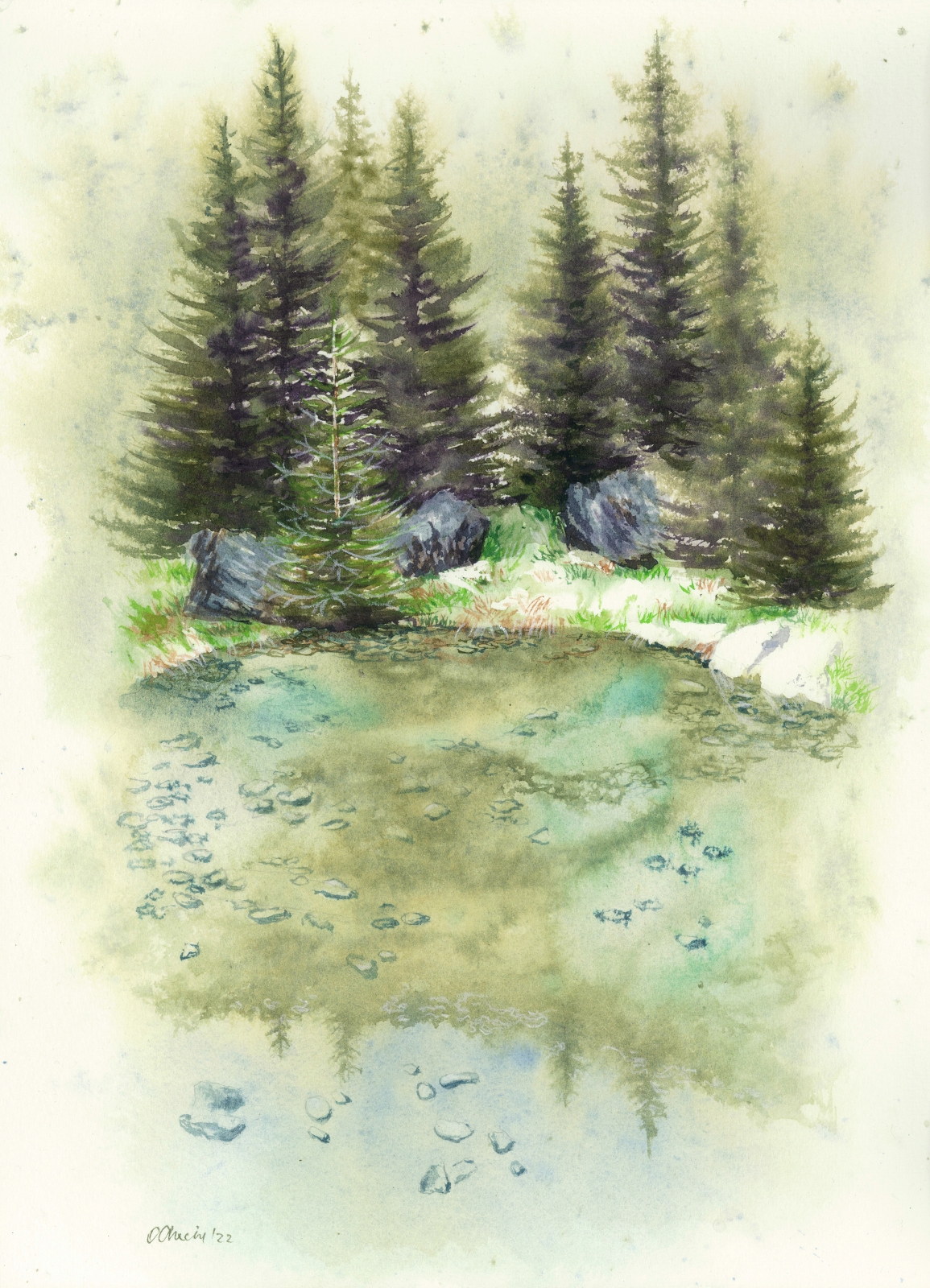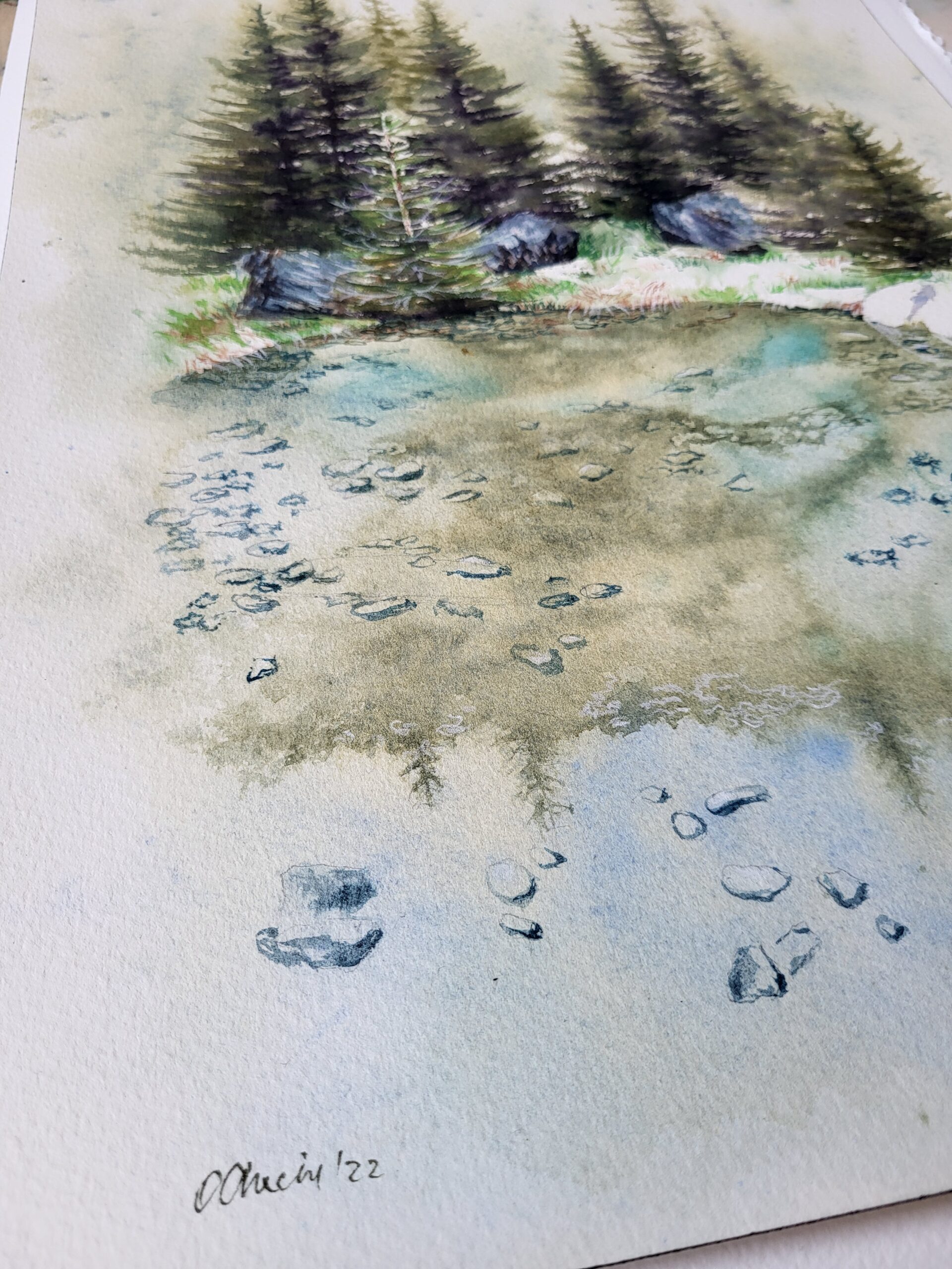 “Small Lake and Fir Trees”- I used professional watercolors on Saunders Waterford cold pressed cotton paper, 300g/m. For some of the accents I used watercolor white pencil. 26×36 cm. 2022