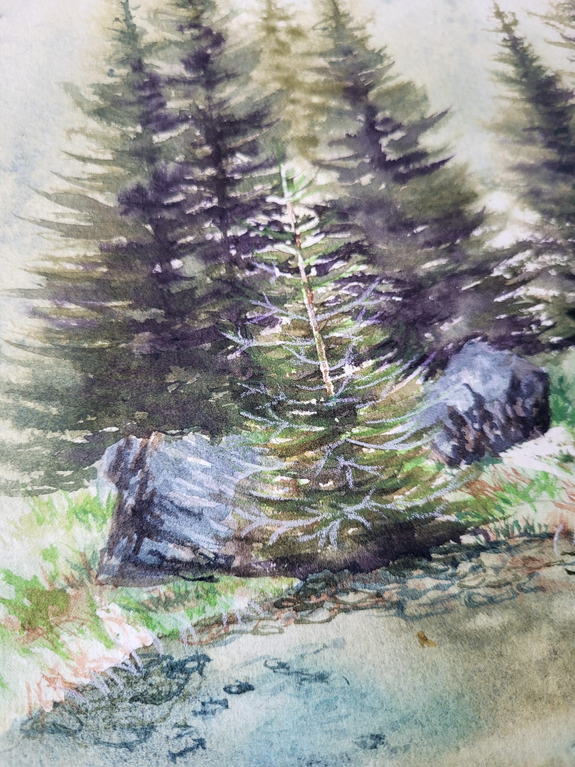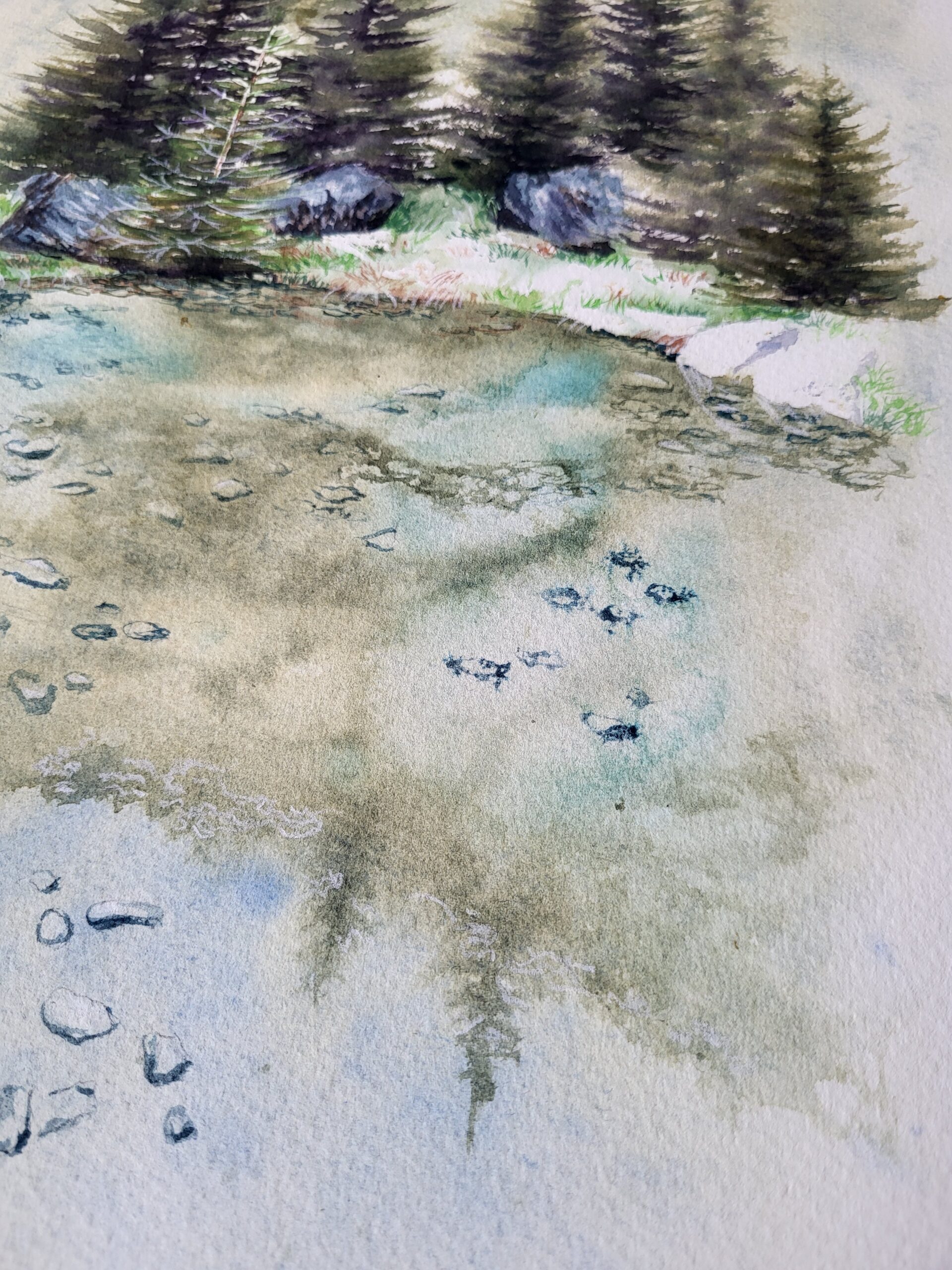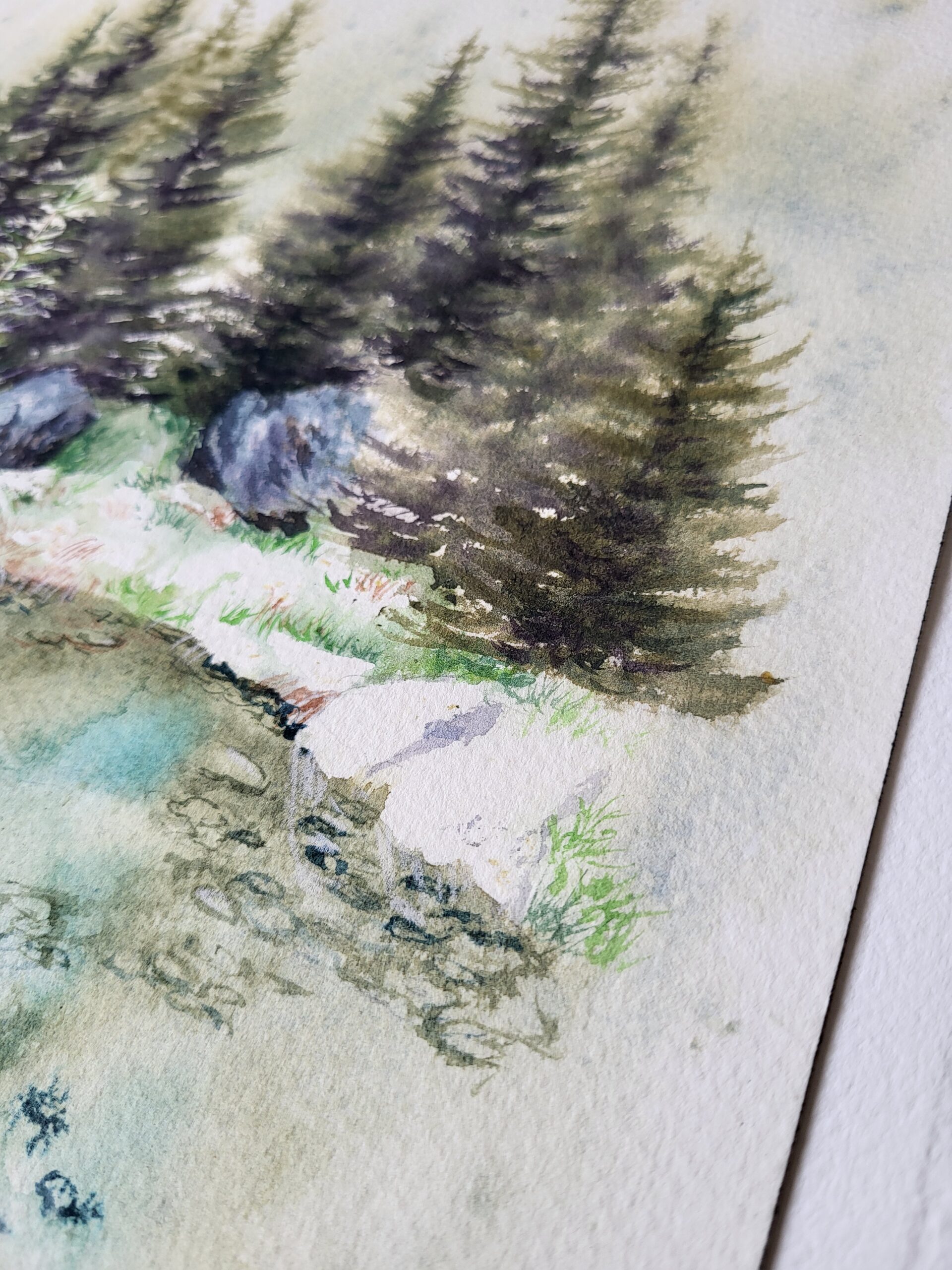“Small Lake and Fir Trees”- I used professional watercolors on Saunders Waterford cold pressed cotton paper, 300g/m. For some of the accents I used watercolor white pencil. 26×36 cm. 2022