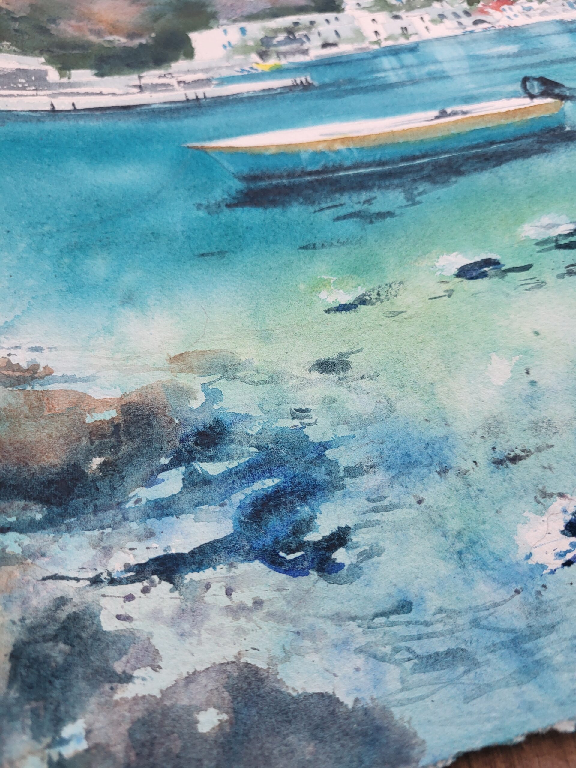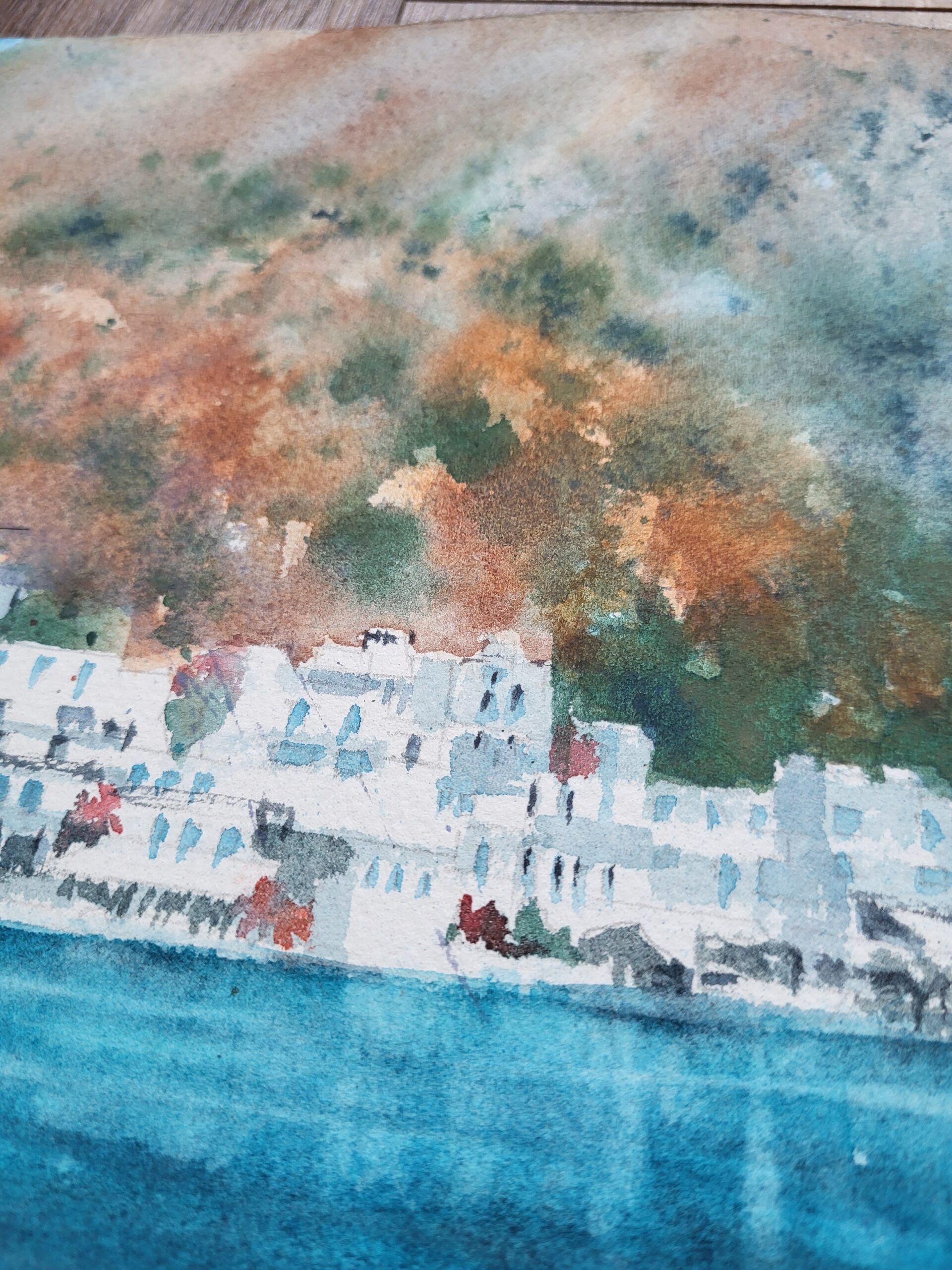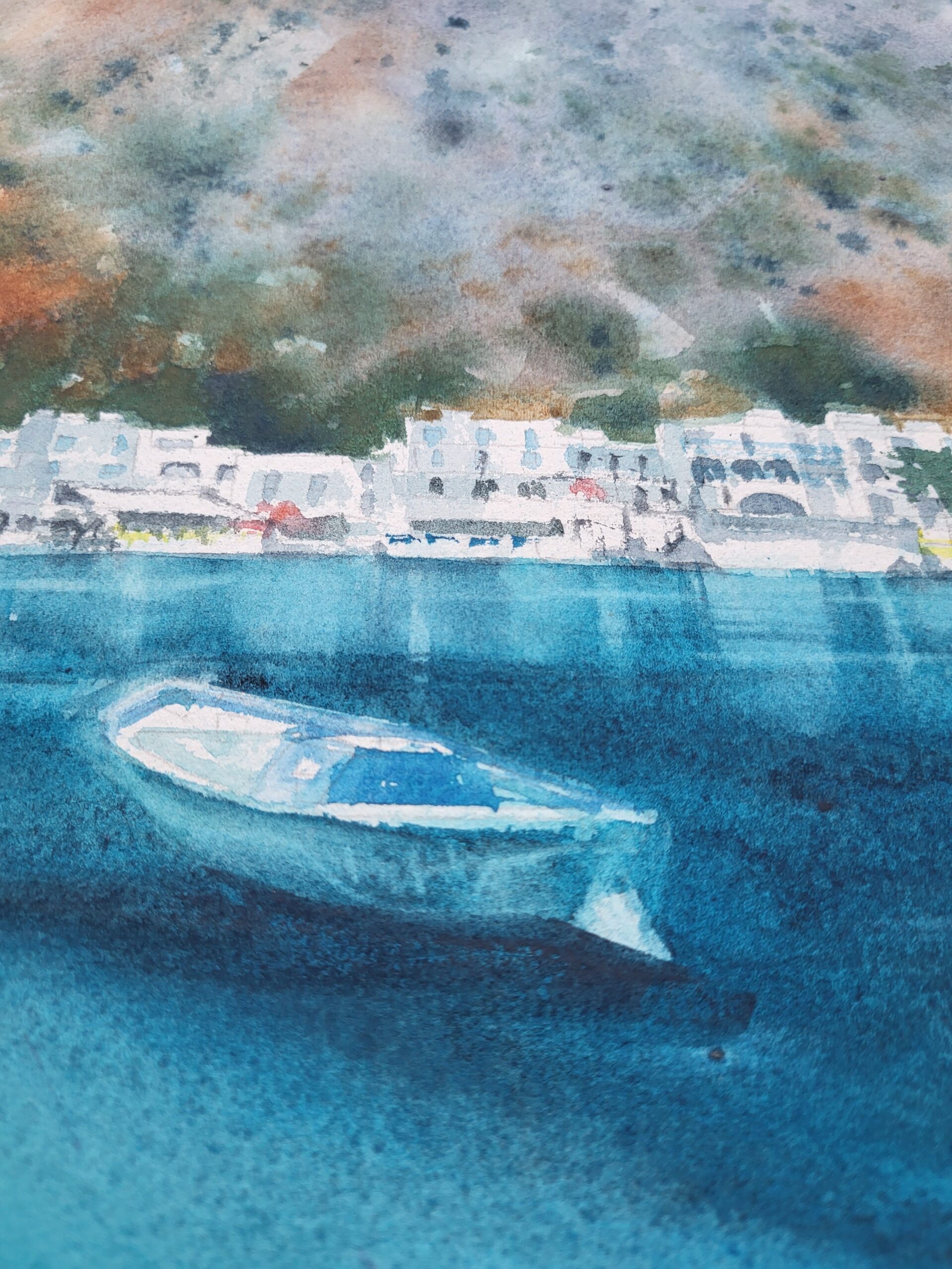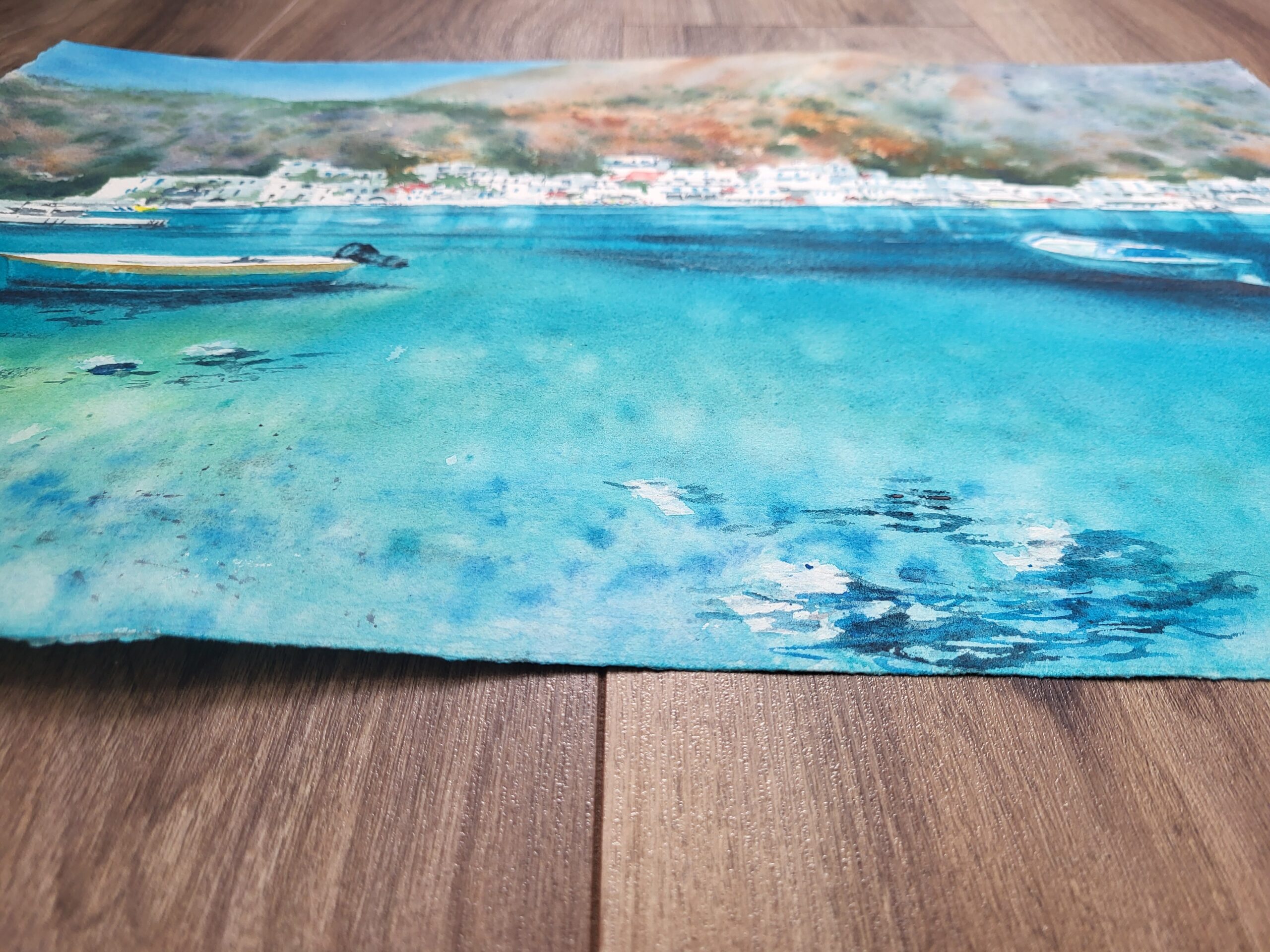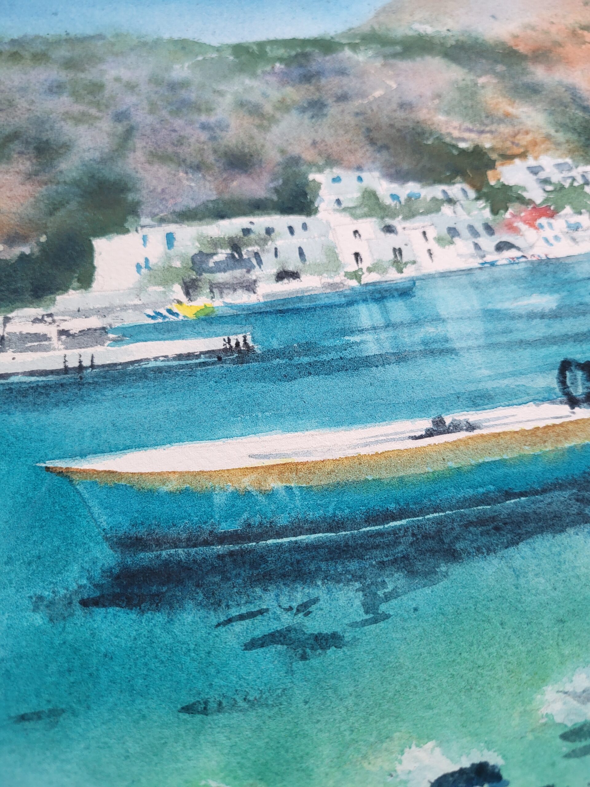Painted with transparent watercolors on fine Arches cotton paper, this piece combines soft washes with precise brushwork. The sea transitions from pale aquamarine near the shore to deep ultramarine in the distance. Subtle reflections of boats ripple across the surface, adding movement and depth. The white buildings of Loutro are painted with delicate strokes, allowing the paper’s brightness to suggest sunlight. Warm touches of ochre and terracotta bring contrast to the cool blues and greens, while the rugged hills in the background are rendered with loose, textured washes.
