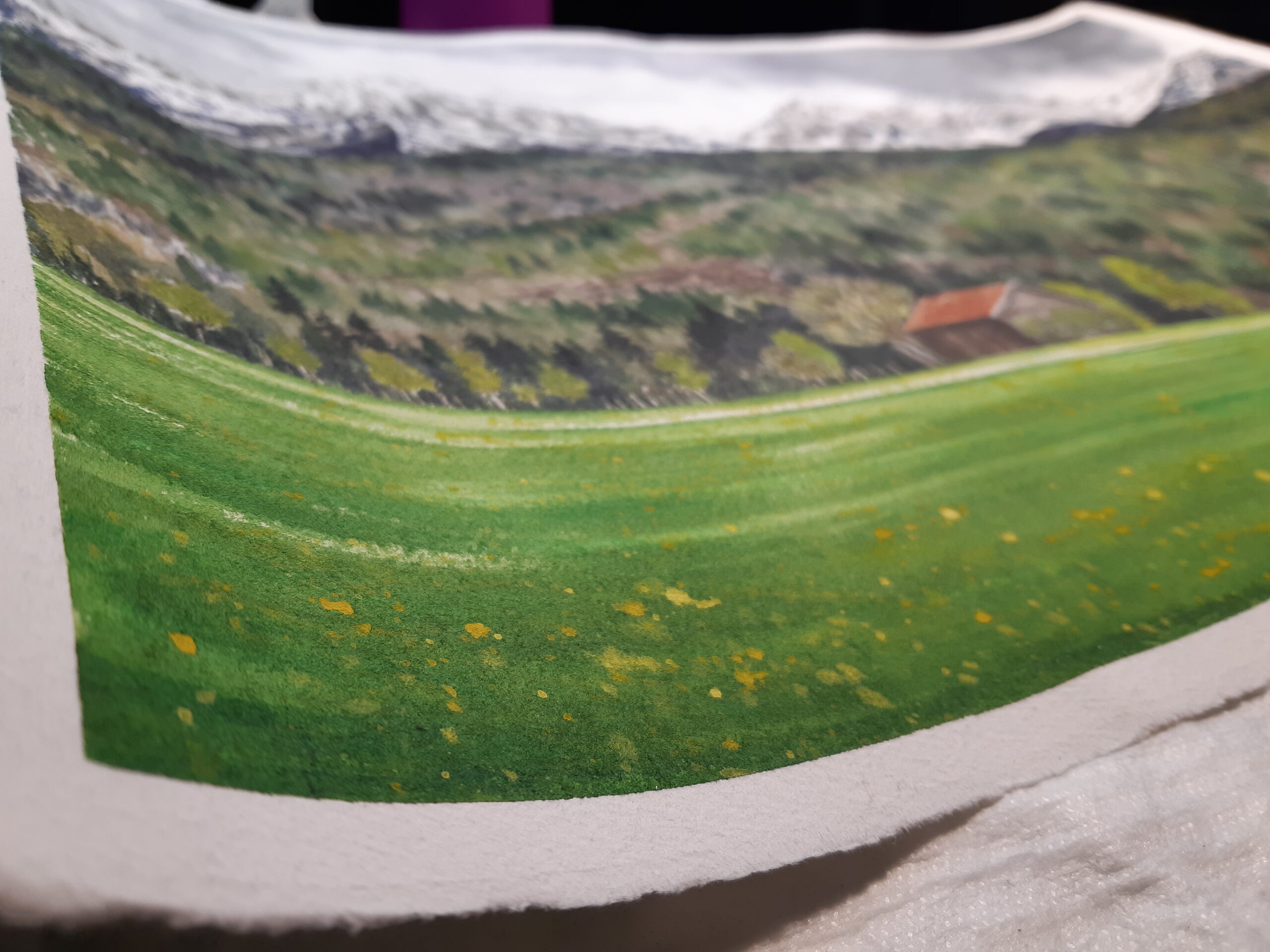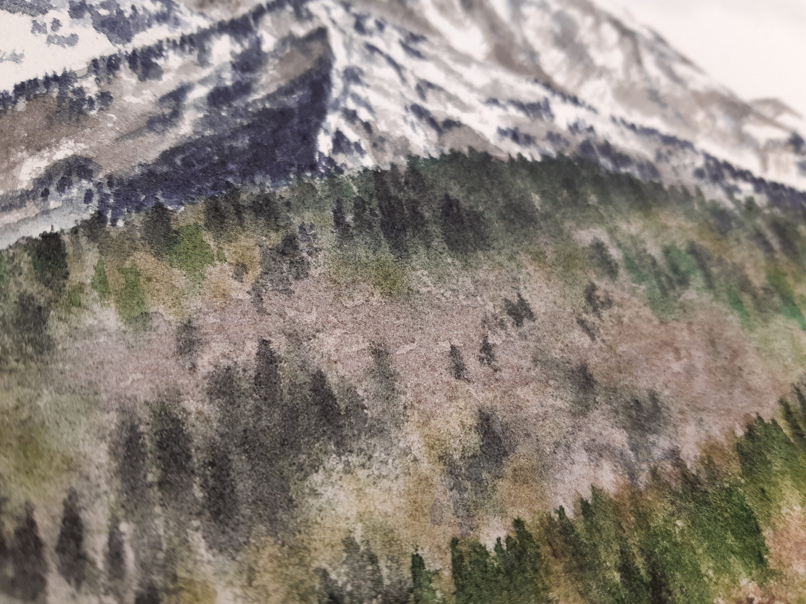 “The Last Snow” original artwork depicts an early windy and chilly spring day, when the mountain tops are still covered in snow while the forests and meadow below are starting to bloom or even flourish.