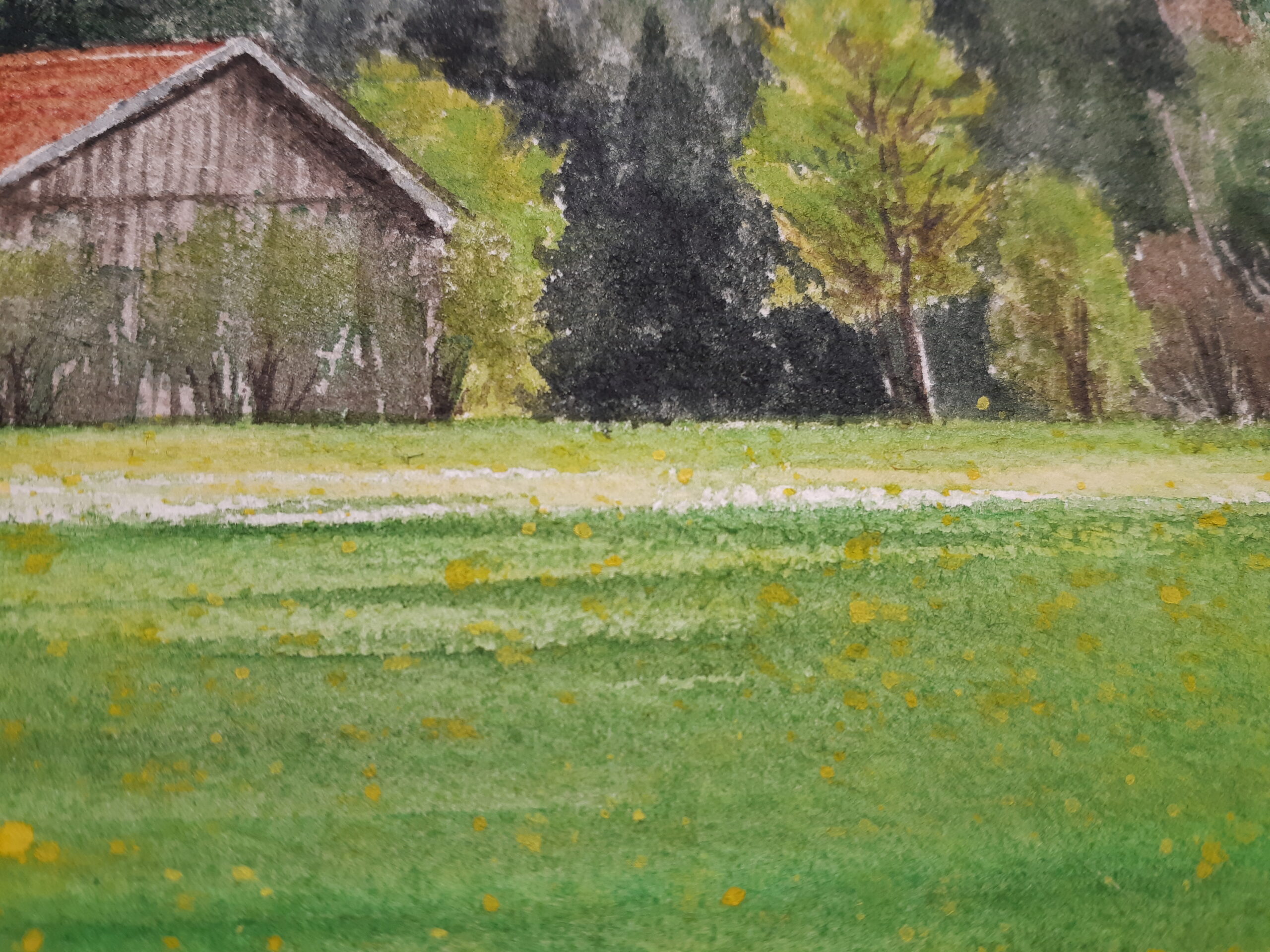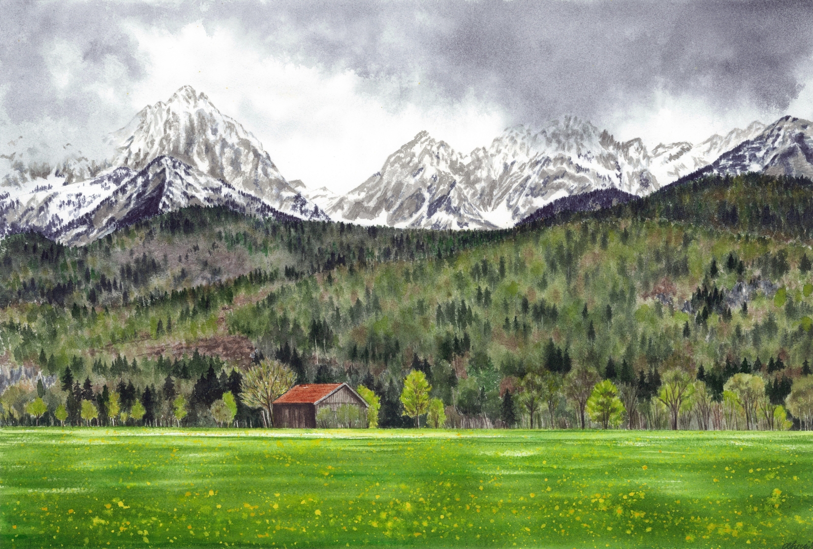 The reference photo for this painting  was taken by me on a trip to Neuschwanstein, Germany. The artwork depicts an early windy and chilly spring day, when the mountain tops are still covered in snow while the forests and meadow below are starting to bloom or even flourish. The composition is horizontally oriented, with snow-capped peaks dominating the background, a dense forested slope in the midground, and a bright green field in the foreground. The brushwork varies across the composition to capture different textures. The mountains are rendered with sharp, angular strokes and fine detailing, emphasizing their rugged, rocky surfaces and snow-covered ridges. In contrast, the forested slopes are painted with layered, stippled, and dappled brushwork, creating the impression of countless trees without defining each individually. The meadow in the foreground is achieved with smooth, horizontal strokes, punctuated by small, delicate touches of yellow to suggest wildflowers scattered across the grass. The washes are used to establish atmosphere and depth. The sky is painted with broad, wet-on-wet washes of gray, blending seamlessly to suggest heavy, overcast clouds. The mountains employ a combination of light washes for snow and darker, more concentrated washes for shadowed rock faces, creating strong contrasts. The forest is built up with multiple transparent washes of green, brown, and gray, layered to achieve density and variation in tone. The meadow features a luminous wash of green, with subtle gradations that suggest light falling across the field. The technique combines wet-on-wet blending for the sky and distant mountains with dry brush and stippling for the forest textures. The barn in the midground is painted with controlled, precise strokes, its red roof standing out as a focal point against the natural palette.