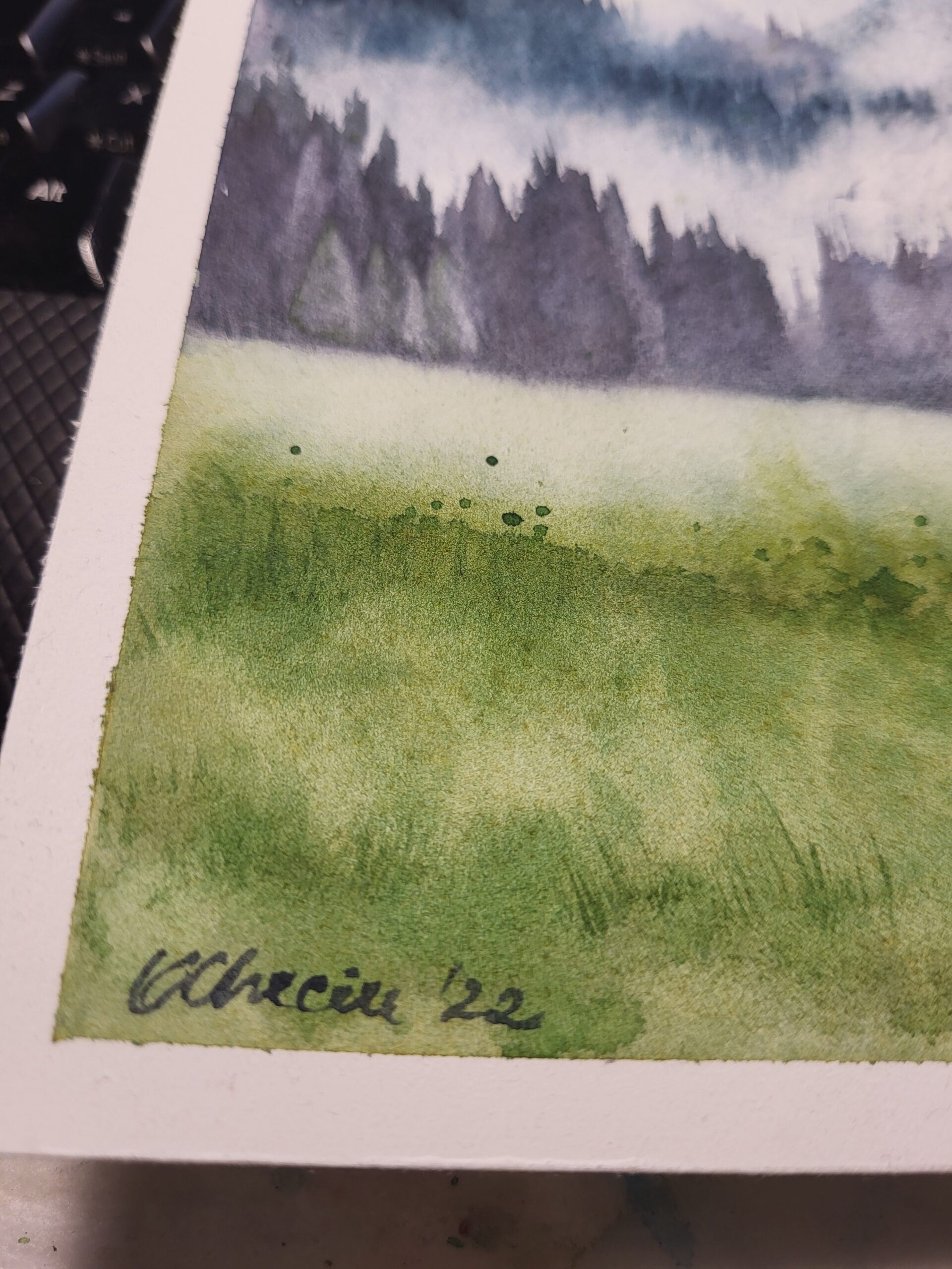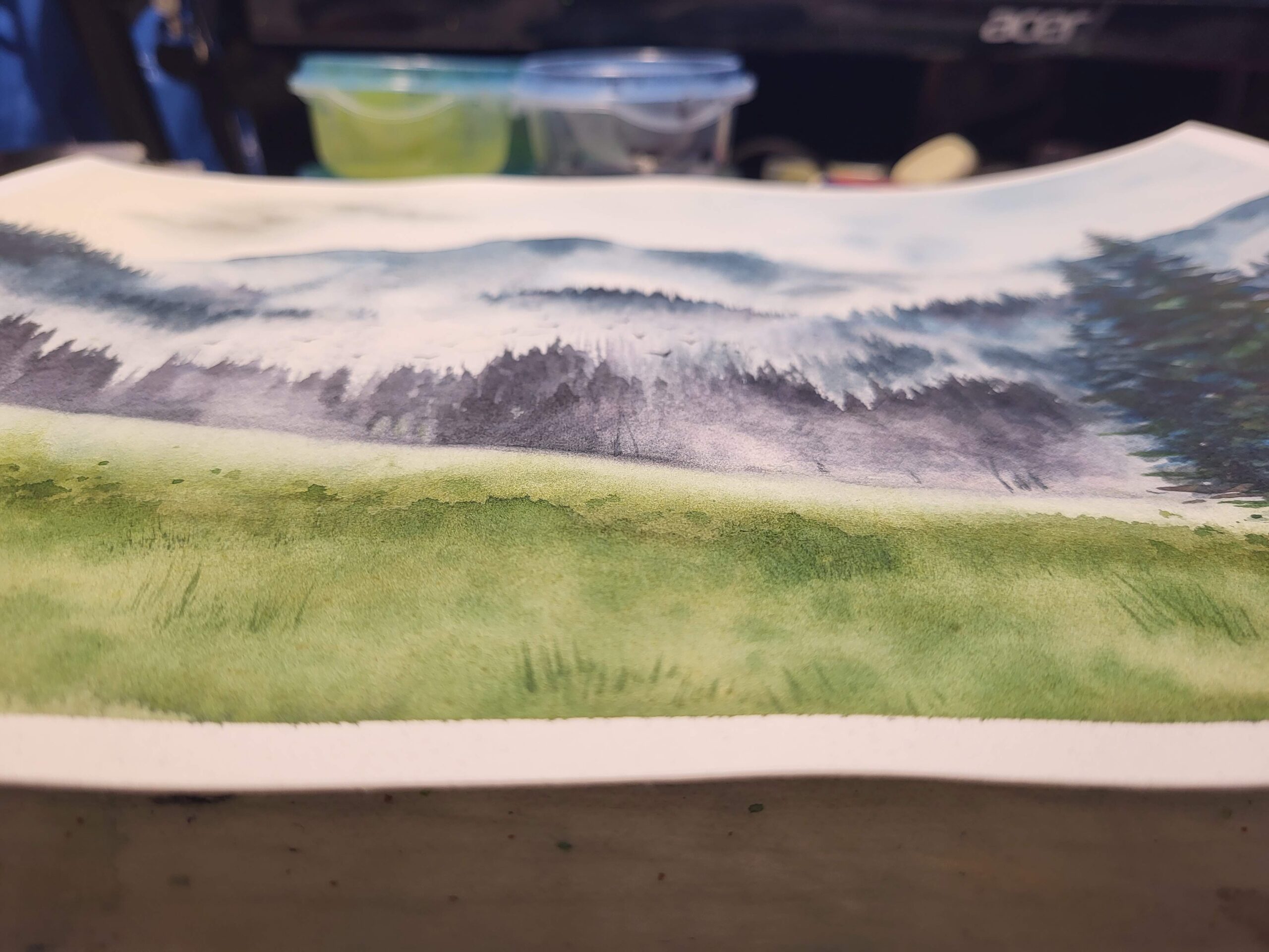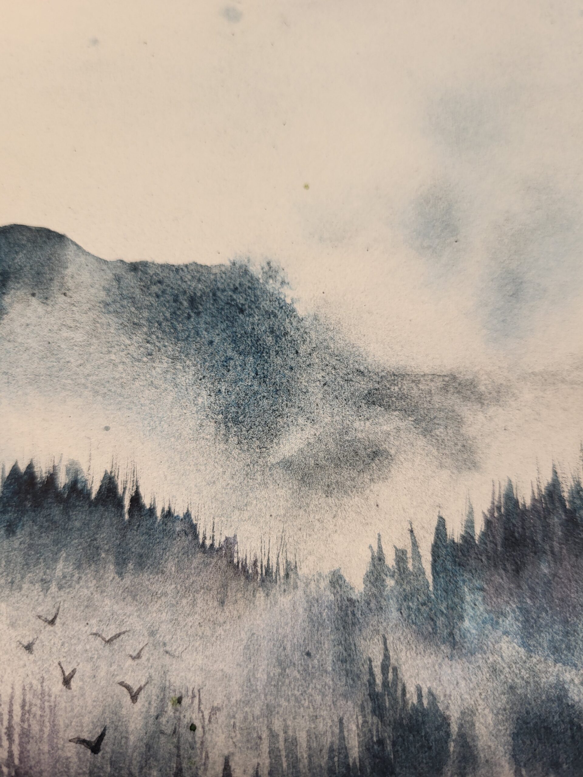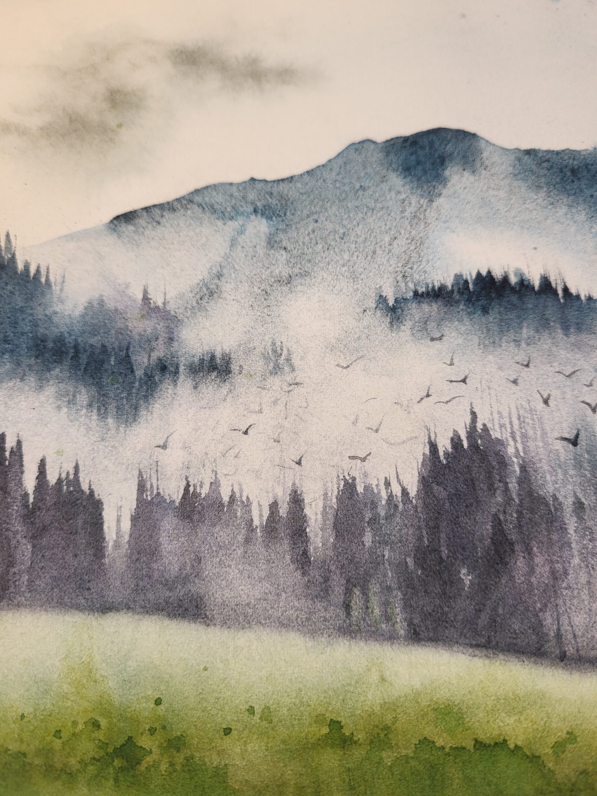 This watercolor painting depicts a misty mountain landscape, where layers of forested hills recede into the distance beneath a soft, clouded sky. The composition emphasizes atmosphere and depth, with the natural white of the paper preserved to create highlights and mist. The foreground features an open meadow, painted with smooth washes of green that shift in tone to suggest light falling across the grass. A narrow path runs diagonally toward the right, leading the eye to a cluster of tall evergreen trees. These trees are rendered with darker, layered washes of green and blue, their sharp, vertical forms contrasting with the softness of the background. The midground is filled with dense forest, painted in overlapping layers of dark green and gray. The edges of the trees are softened with wet-on-wet blending, creating the effect of mist drifting through the valleys. The untouched paper provides luminous breaks, enhancing the sense of fog and atmosphere. The background mountains rise in muted blue-gray washes, their ridges softened to suggest distance. Subtle variations in tone give them form without overpowering the scene. Above, the sky is painted with diluted washes of gray and blue, with areas of paper left bare to suggest light filtering through clouds. The technique combines transparent washes for atmosphere, wet-on-wet blending for mist, and controlled, darker strokes for the evergreens in the foreground. The deliberate preservation of the paper’s white creates natural highlights and enhances the sense of depth.