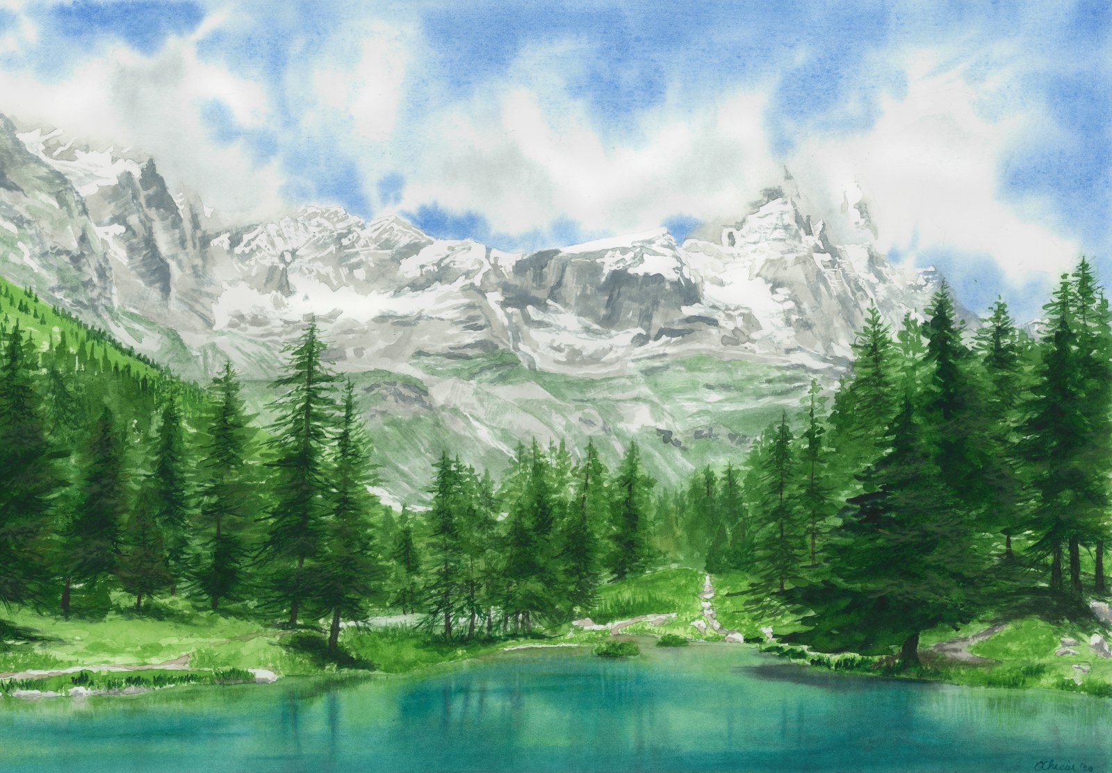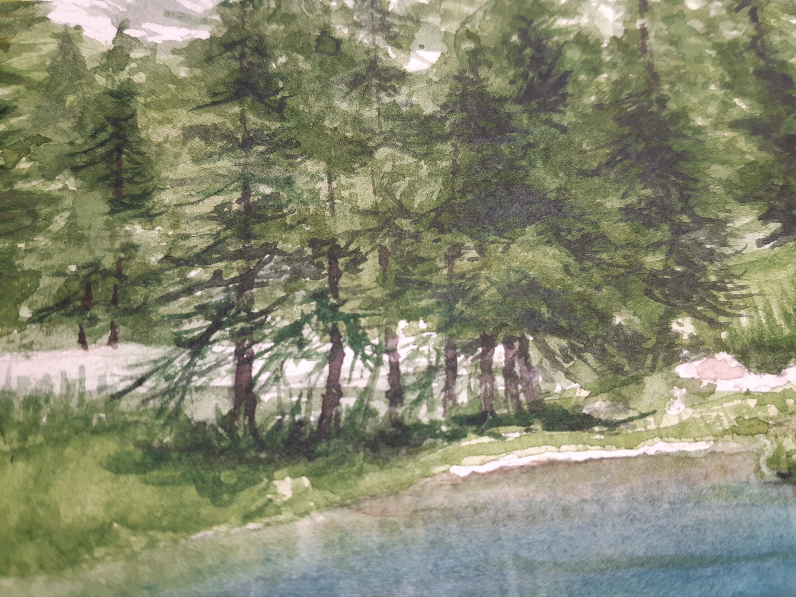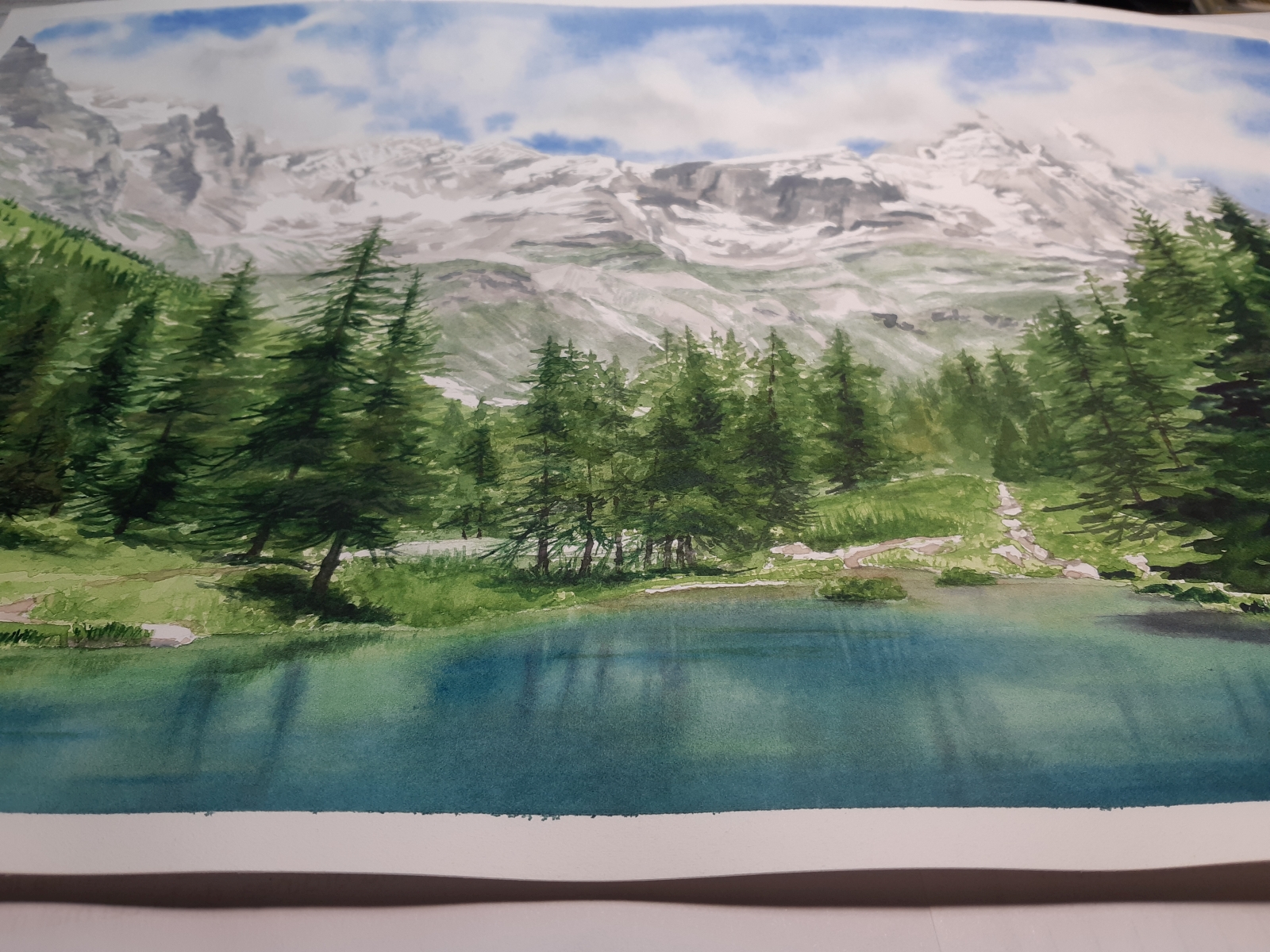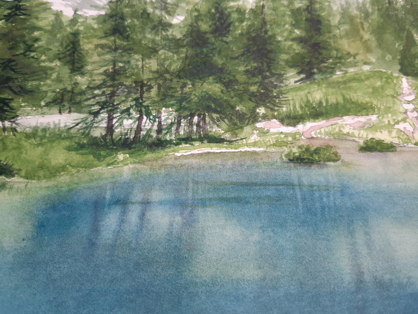 This watercolor painting depicts a tranquil alpine scene, where a clear turquoise lake reflects the surrounding evergreens and towering snow-capped mountains. The composition balances the stillness of the water with the grandeur of the peaks above, using the white of the paper to create natural highlights and luminosity. The foreground features the calm surface of the lake, painted with transparent washes of turquoise and blue. Subtle variations in tone suggest depth and reflection, while untouched areas of paper create shimmering highlights across the water. The grassy banks are painted with layered greens, with dry brush and stippling adding texture to the vegetation. The midground is dominated by tall evergreen trees, painted in deep greens with layered washes to capture both shadow and light. The background showcases dramatic mountain peaks, painted with layered washes of gray, brown, and muted green. Wet-on-wet blending softens the slopes, while sharper, darker strokes define ridges and rocky textures. The untouched paper forms bright highlights along the summits, suggesting snow and sunlight striking the rock faces. The sky is painted with a smooth wash of blue, transitioning into soft, billowing clouds. The clouds are created by leaving areas of the paper untouched, giving them a luminous, natural brightness that contrasts with the saturated sky. The technique combines transparent washes for water and sky, layered strokes for trees, and broken washes for rocky textures. The deliberate preservation of the paper’s white enhances the brightness of clouds, snow, and reflections, giving the painting a natural radiance.