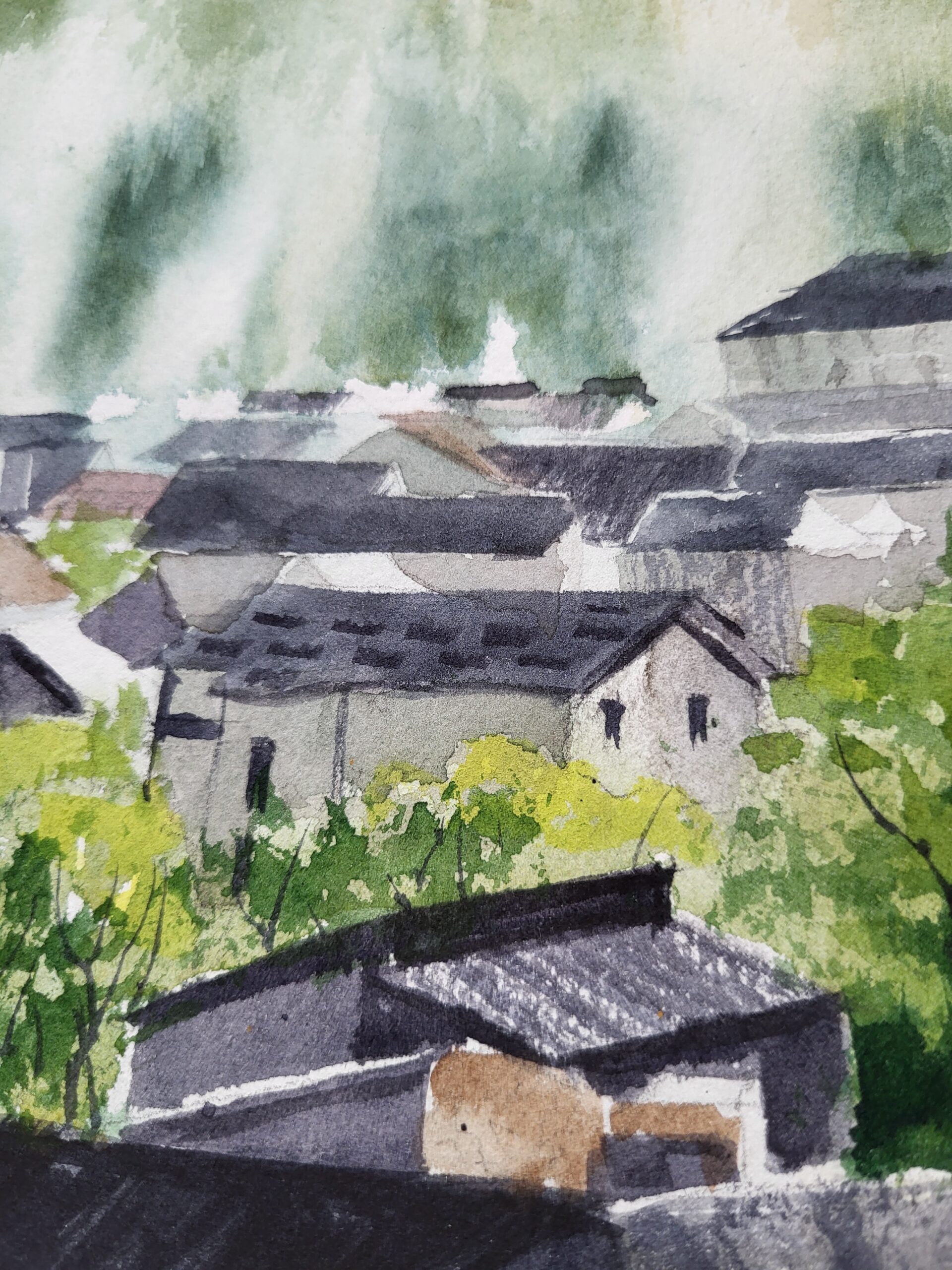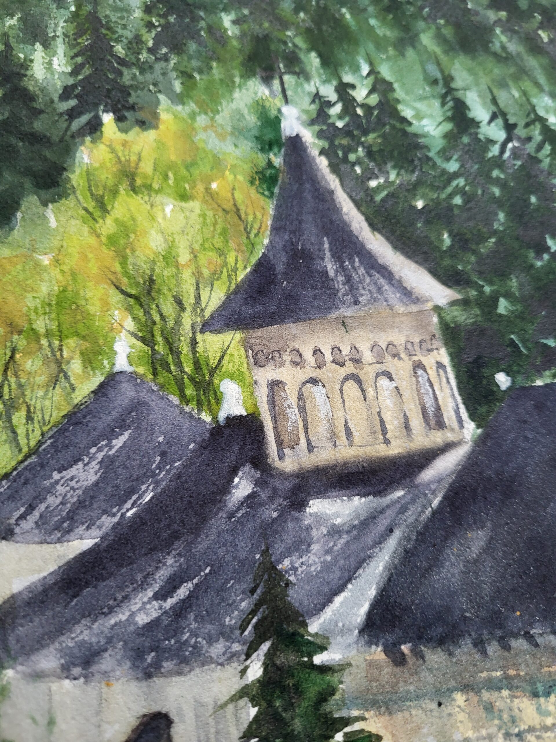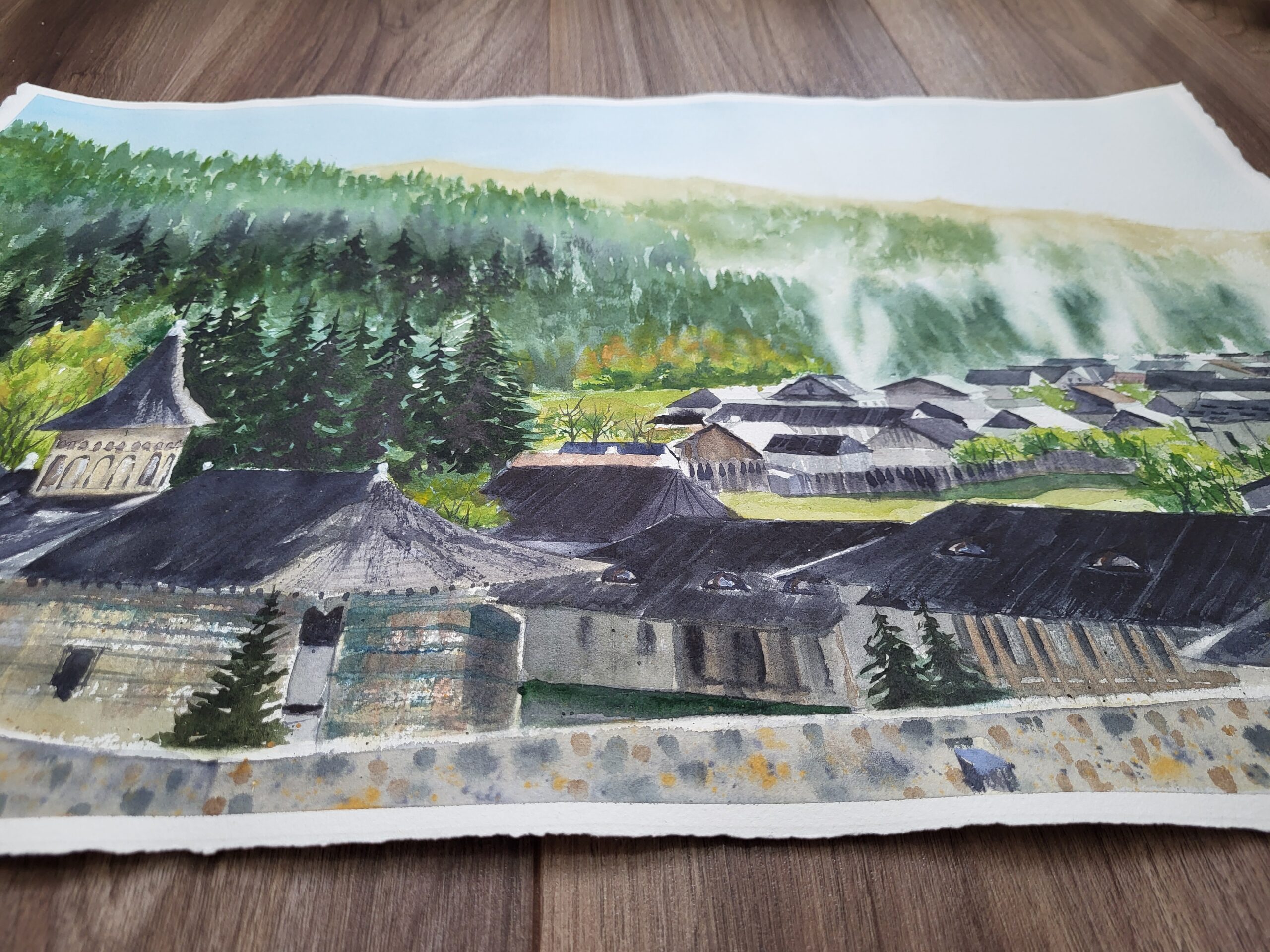 This watercolor painting depicts the village of Voroneț in Bucovina, Romania, with its famous monastery in the foreground and the surrounding forested hills rising in the background. The composition highlights the harmony between architecture and nature, with the white of the paper preserved to create light, atmosphere, and natural luminosity. The foreground is dominated by the monastery complex, painted with layered washes of gray, brown, and muted blue. The church tower rises prominently, its roof rendered in dark tones with subtle highlights left as untouched paper to suggest sunlight reflecting off the shingles. The stone walls are painted with textured washes of gray and ochre, while preserved white areas define windows and architectural details, enhancing the clarity of the structure. The midground features the village of Voroneț, with clusters of houses painted in muted grays and browns. Their rooftops are defined with angular strokes, while lighter areas of untouched paper suggest sunlight striking the buildings. Thin smoke rising above the rooftops from chimneys, blends softly into the sky and adds a sense of daily life and atmosphere. The background is filled with dense forested hills, painted in deep greens and layered washes to create depth. The darker tones of the evergreens contrast with the lighter, sunlit areas of deciduous trees. Further back, the hills fade into soft golden tones, achieved with diluted washes, while the untouched paper creates the effect of mist and sunlight filtering through the landscape. The sky is painted with a pale, transparent wash of blue, transitioning into soft light near the horizon. The preserved white of the paper forms the brightest areas, suggesting morning light breaking over the hills. The technique combines transparent washes for atmosphere, wet-on-wet blending for mist and smoke, and precise strokes for architectural details. The deliberate preservation of the paper’s white enhances the brightness of the sky, the highlights on rooftops, and the luminous mist rising from the valley.