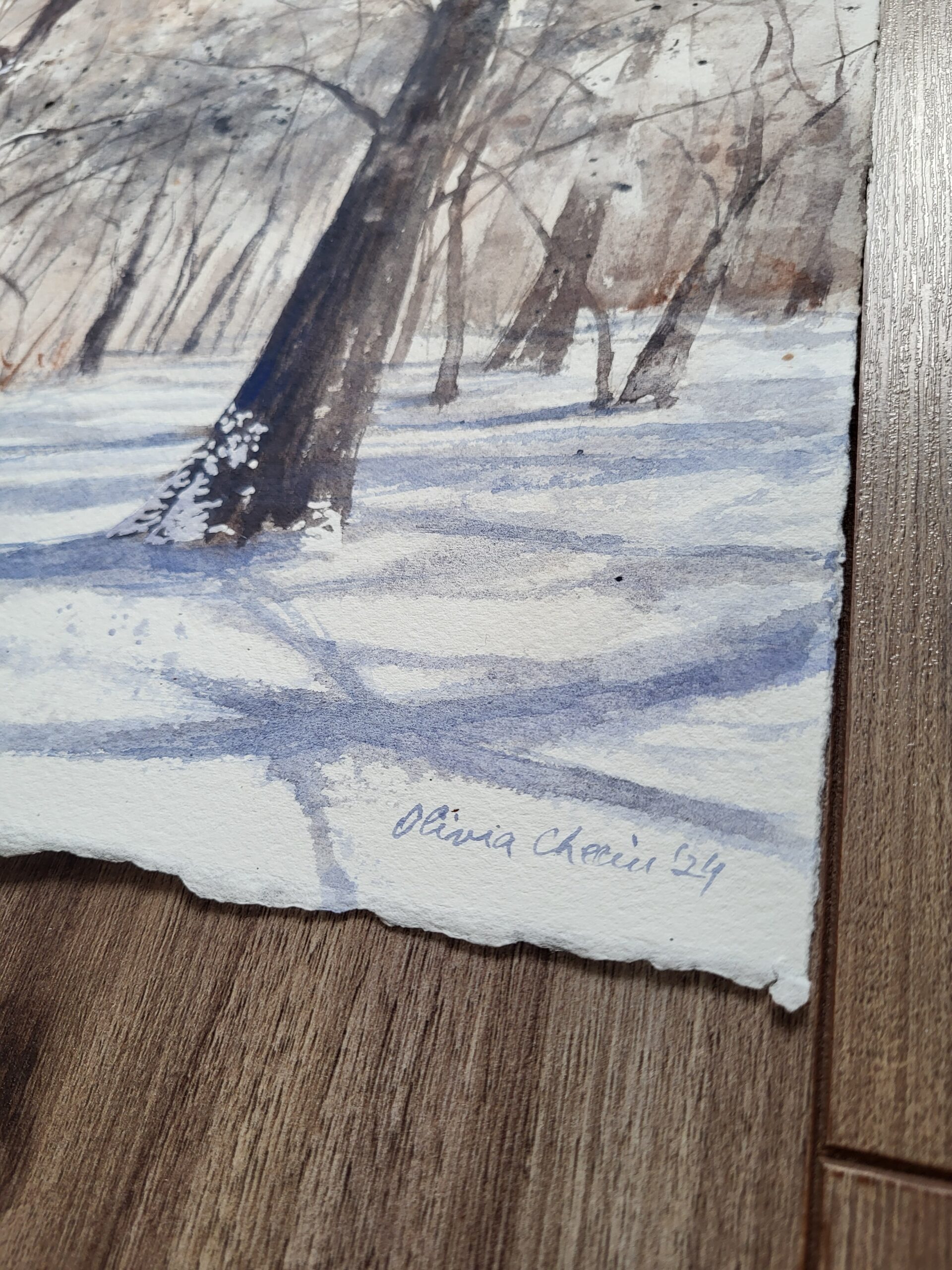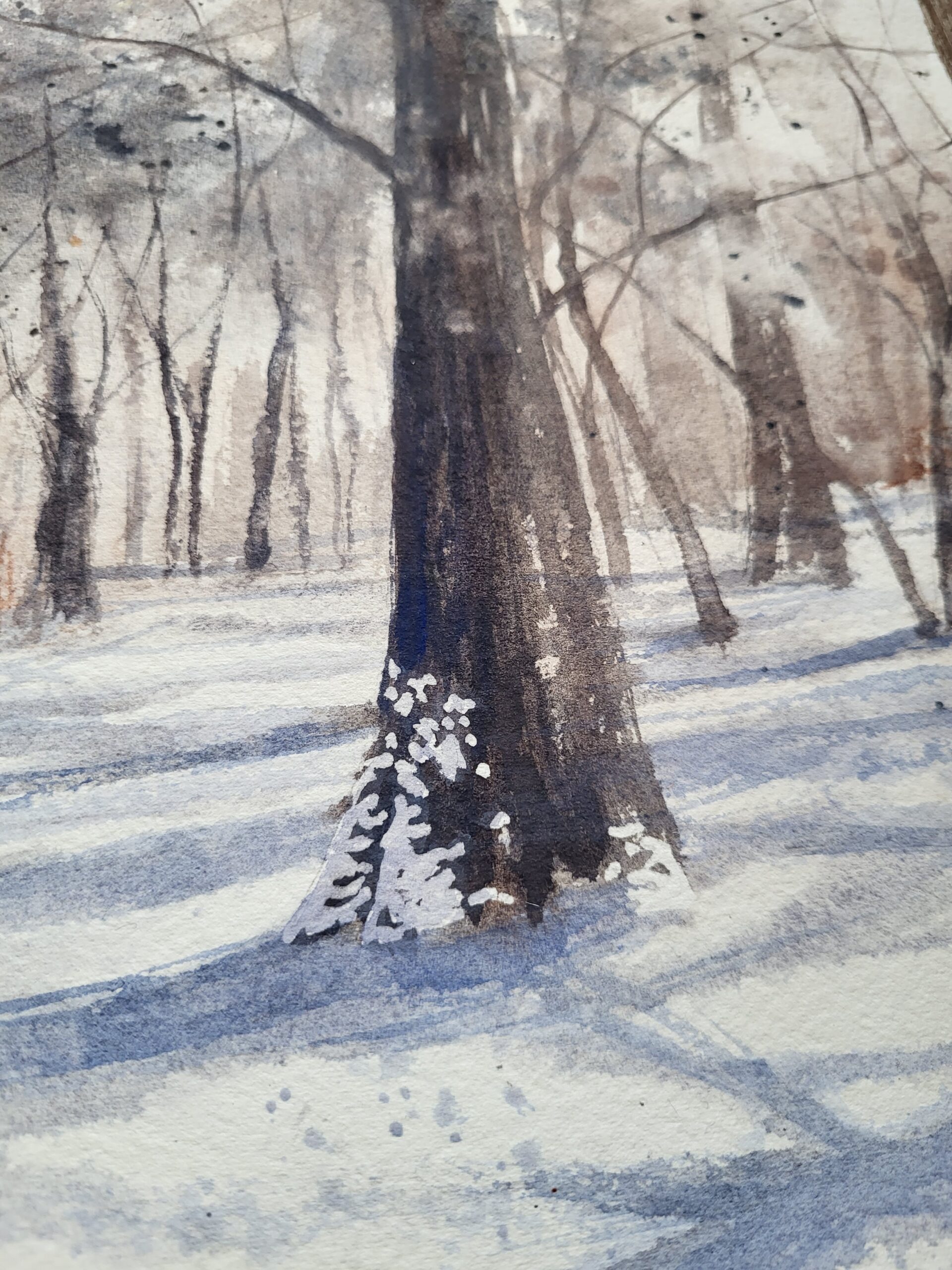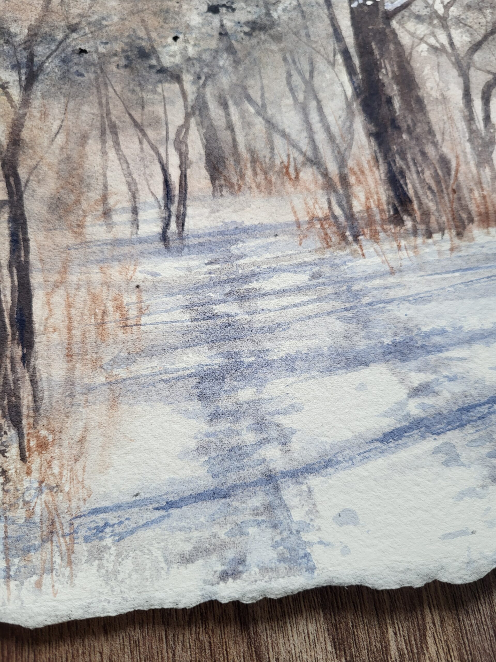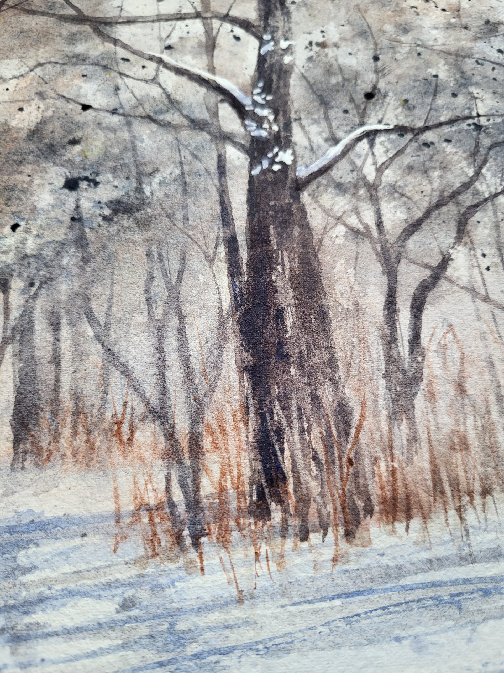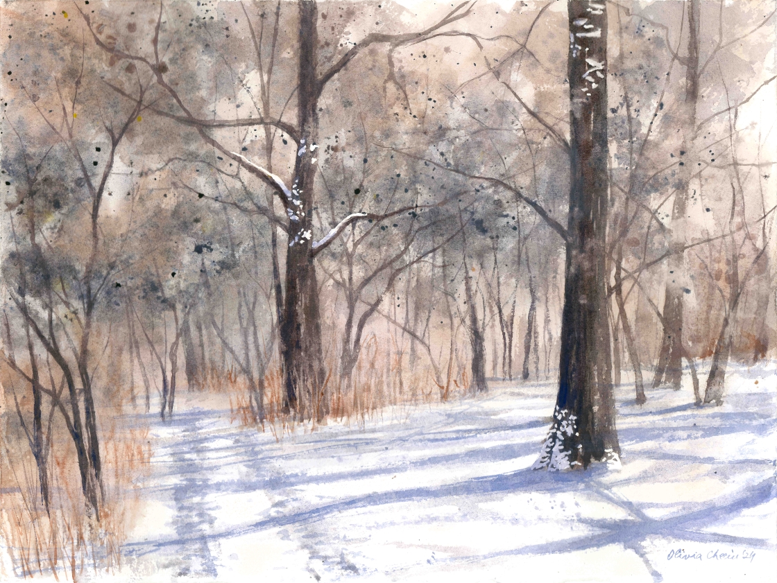 This watercolor painting depicts a quiet winter forest, where tall trees rise from a snow-covered ground. The composition captures the stillness of a cold day, with soft light filtering through the bare branches. The foreground shows a blanket of snow stretching across the ground, painted with cool washes of blue and violet to suggest long shadows cast by the trees and human traces. The untouched white of the paper forms the brightest highlights, giving the snow a crisp, luminous quality. The midground is filled with tall tree trunks, painted in deep browns and grays. Their vertical forms contrast with the horizontal sweep of shadows across the snow. Small touches of white paper along the bark suggest patches of snow clinging to the trunks. The background fades into a misty woodland, where thinner trees and branches are painted in soft washes of gray and brown. The blending of tones creates a hazy atmosphere, suggesting distance and depth. Golden-brown grasses emerge from the snow at the edges of the forest, painted with warm strokes that contrast with the cool tones of the snow and shadows. The sky is not directly visible, but the pale washes of gray and beige in the background suggest a soft, overcast light filtering through the trees. The technique combines transparent washes for the snow and background, layered tones for the trees, and fine linear brushwork for the branches. The preserved white of the paper enhances the brightness of the snow and the subtle highlights on the trunks.