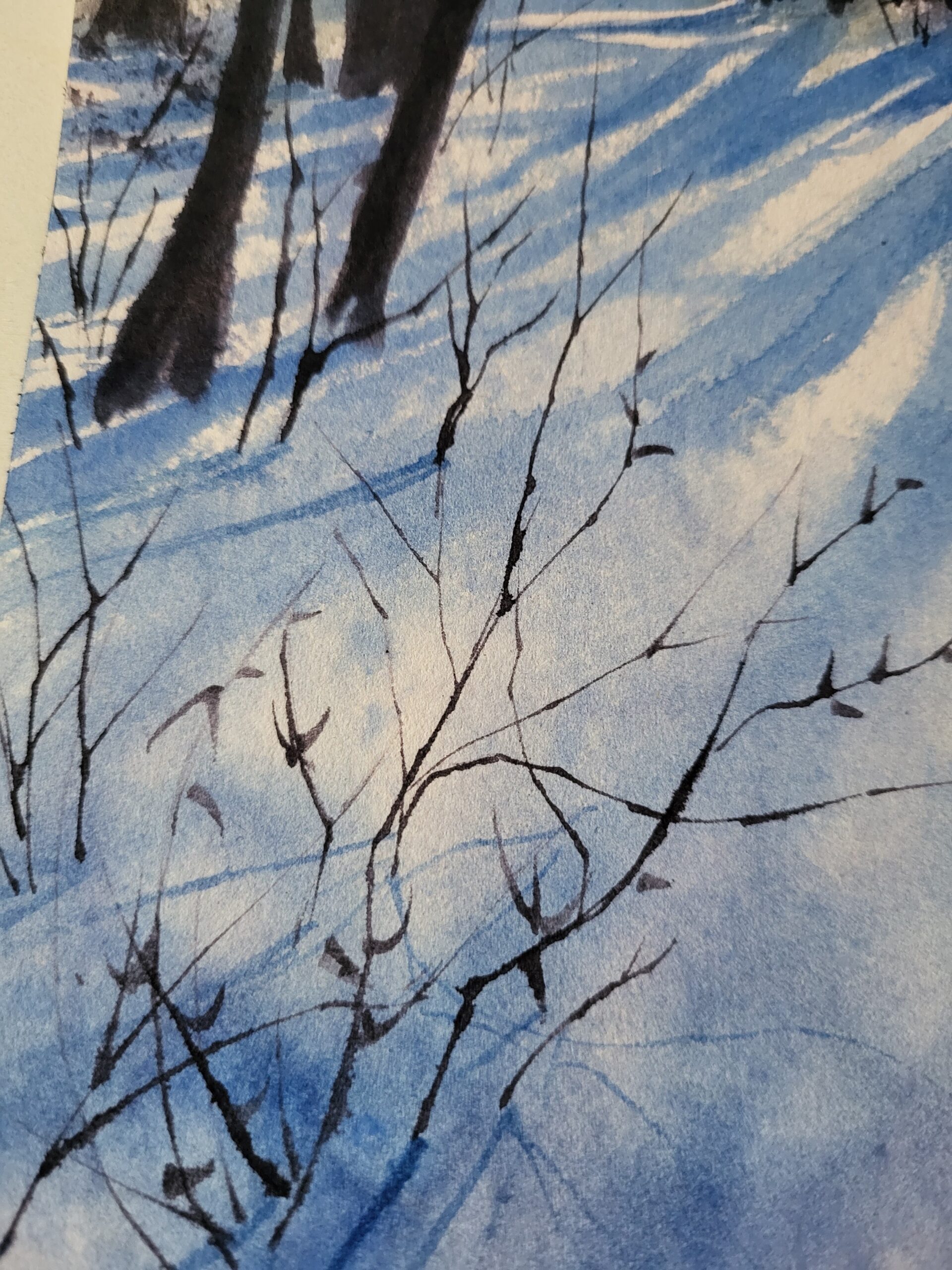 This watercolor painting depicts a serene winter forest, where tall, bare trees rise above a snow-covered ground bathed in soft light. The composition emphasizes the contrast between the cool tones of the snow and the warm glow of the sky. The foreground shows a wide expanse of snow, painted in layered washes of blue and violet. Long, diagonal shadows stretch across the ground, cast by the trees. The untouched white of the paper forms luminous highlights, suggesting patches of sunlight glimmering on the snow. Sparse twigs and branches emerge delicately from the snow, painted with fine, linear strokes. The midground is filled with slender tree trunks, painted in deep browns and grays. Their vertical forms create a rhythmic pattern, while the darker clusters of foliage near the top add weight and texture to the composition. The background glows with soft light, where pale washes of pink, peach, and beige blend into the cooler tones of the forest. This subtle gradient suggests the warm glow of a winter sunset light filtering through the trees. The brightness of the paper enhances the effect of distant light breaking through the woodland. The sky transitions from warm pinks and oranges near the horizon to pale, muted tones above, creating a gentle contrast with the cool blues of the snow below. The technique combines wet-on-wet blending for the snow and sky, layered washes for the trees, and fine brushwork for branches and undergrowth. The preserved white of the paper is essential in creating the brilliance of the snow and the glow of filtered sunlight.