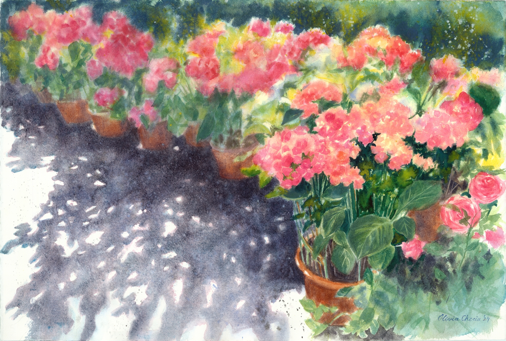 Această acuarelă înfățișează un rând de hortensii în ghiveci, în plină floare, aranjate afară, în lumina puternică a soarelui. Compoziția accentuează interacțiunea dintre florile vibrante, frunzișul luxuriant și umbrele dramatice proiectate pe pământ, creând o scenă plină de viață, dar armonioasă. Florile sunt redate cu o gamă largă de tonuri de roșu, roz și coral, aplicate în lavaje stratificate pentru a surprinde atât vibranța, cât și delicatețea petalelor. Amestecarea ud pe ud produce tranziții moi în cadrul fiecărui grup de flori, în timp ce pensulația ud pe uscat definește marginile petalelor individuale și evidențiază densitatea florilor. Variația de saturație – de la purpuriu intens la roz pal – adaugă profunzime și variație naturală pe rândul de plante. Frunzișul este pictat cu verde stratificat, de la viridian intens la tonuri mai deschise de sevă. Zone largi de culoare stabilesc masa frunzelor, în timp ce tușele controlate și glazurarea sugerează vene și straturi suprapuse. Verdele mai închis de sub flori oferă contrast, făcând florile să pară mai luminoase. Ghivecele de teracotă sunt reprezentate cu nuanțe calde și pământii de sienna arsă și ocru, aplicate ud pe uscat pentru a defini formele lor cilindrice. Umbrele și glazurarea subtilă le conferă volum, în timp ce repetiția lor creează ritm și structură în cadrul compoziției. Fundalul este unul dintre cele mai izbitoare elemente, pictat printr-o combinație de nuanțe ud pe ud și tehnici de ridicare pentru a surprinde umbrele pătate proiectate de plante. Nuanțele intense de indigo, violet și gri sunt stratificate pentru a crea un contrast tonal bogat față de luminozitatea zonelor luminate de soare. Marginile neregulate, rupte, ale umbrelor transmit textura frunzelor care filtrează lumina. Fundalul este atenuat cu nuanțe difuze de verde și galben, sugerând frunziș și lumina soarelui, fără a distrage atenția de la subiectul principal. Acest tratament atmosferic sporește senzația de profunzime și situează florile într-un cadru natural în aer liber.